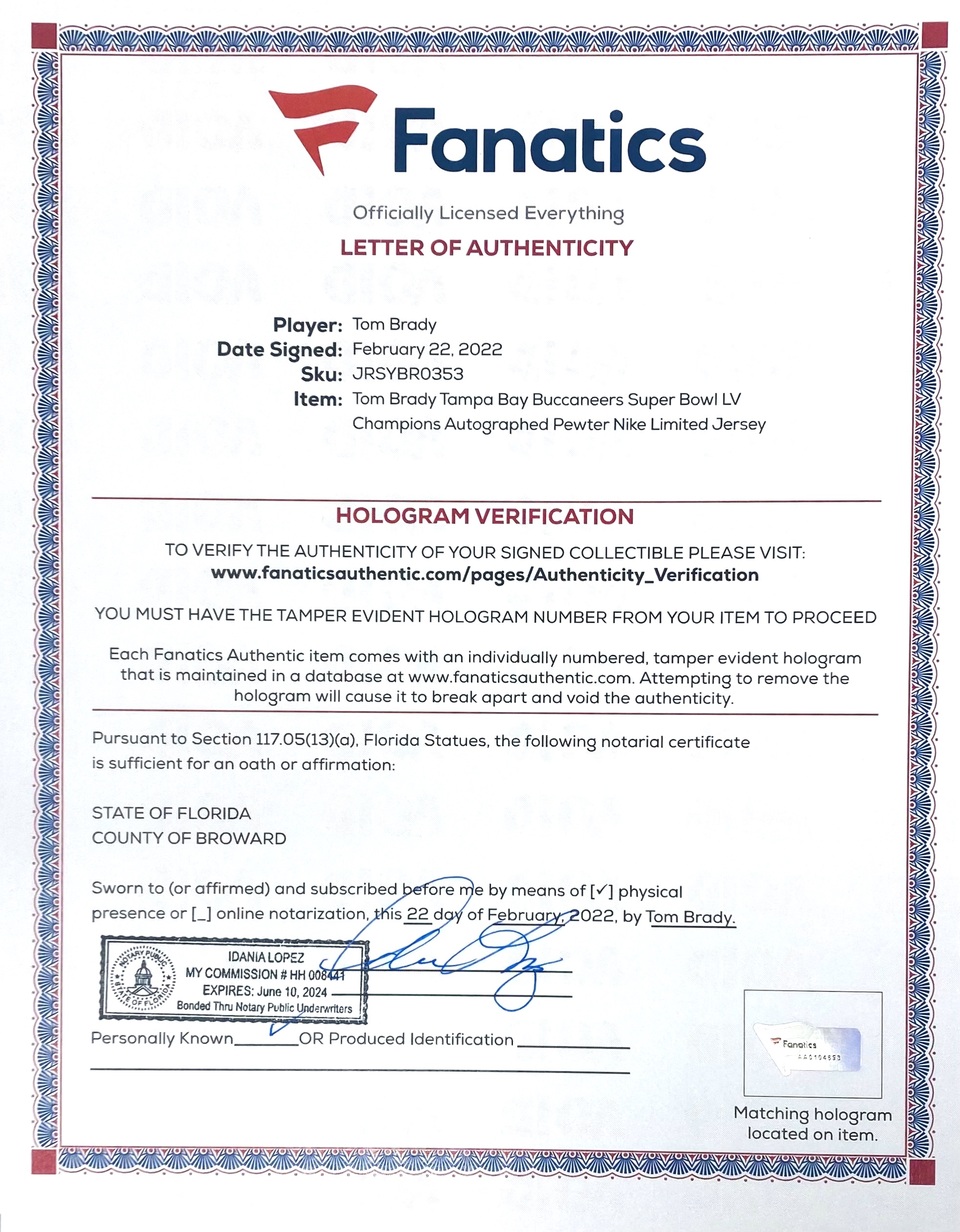 The lot / autograph(s) includes an official Fanatics hologram and matching Letter of Authenticity for authenticity purposes.