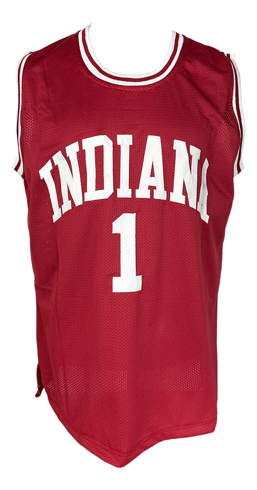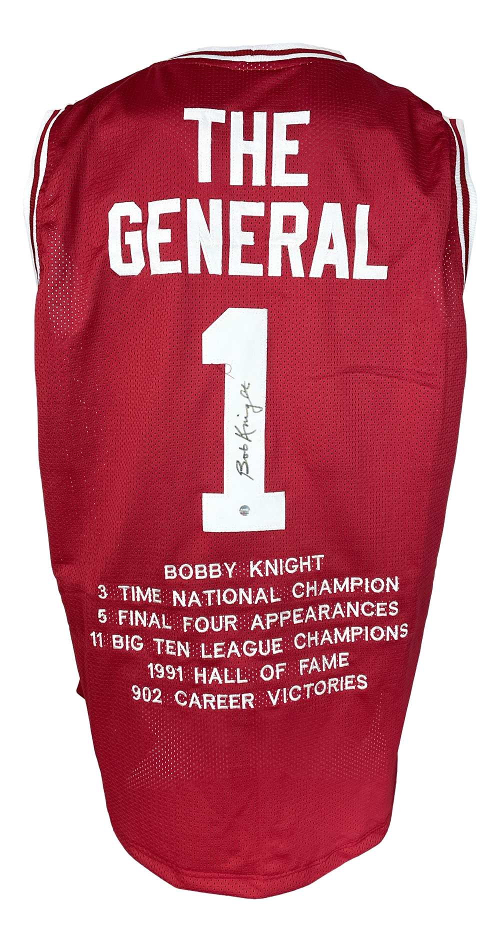 Jersey with everything sewn on, size XL. Hand-signed by Bob Knight (HOF, D. 2023). Knight's career highlights are custom stitched below the numbers on the reverse side of the jersey.