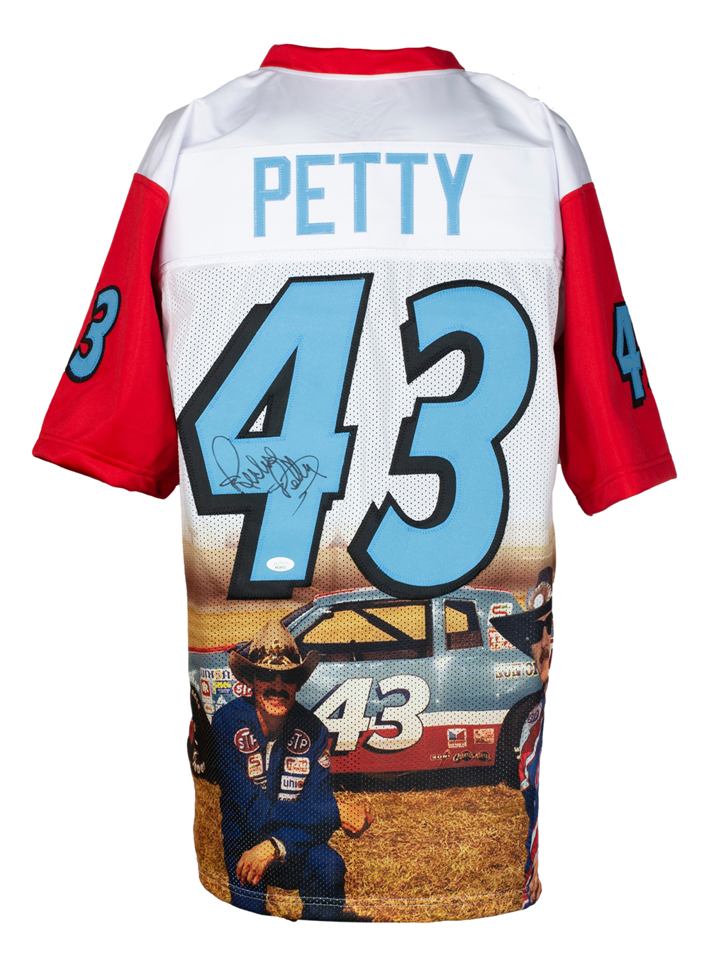Custom on-field style jersey. Everything is sewn on, size XL. Hand-signed by Richard Petty (HOF).