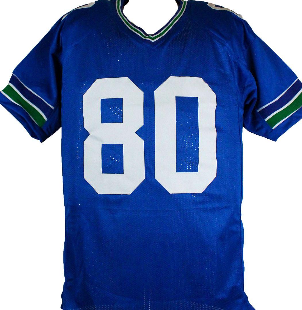 Jersey with everything sewn on, size XL. Hand-signed and inscribed by Steve Largent (HOF). Largent's career highlights have been custom stitched to the back of the jersey below the reverse numbers.