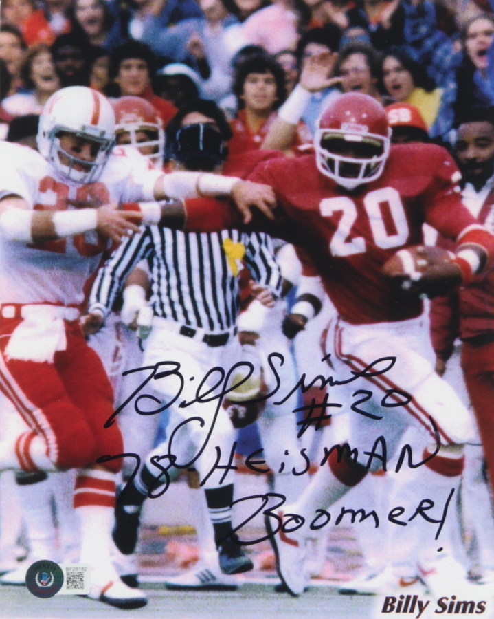 Billy Sims Signed Oklahoma Sooners 8x10 Photo Inscribed "78 Heisman" & "Boomer!" (Beckett)