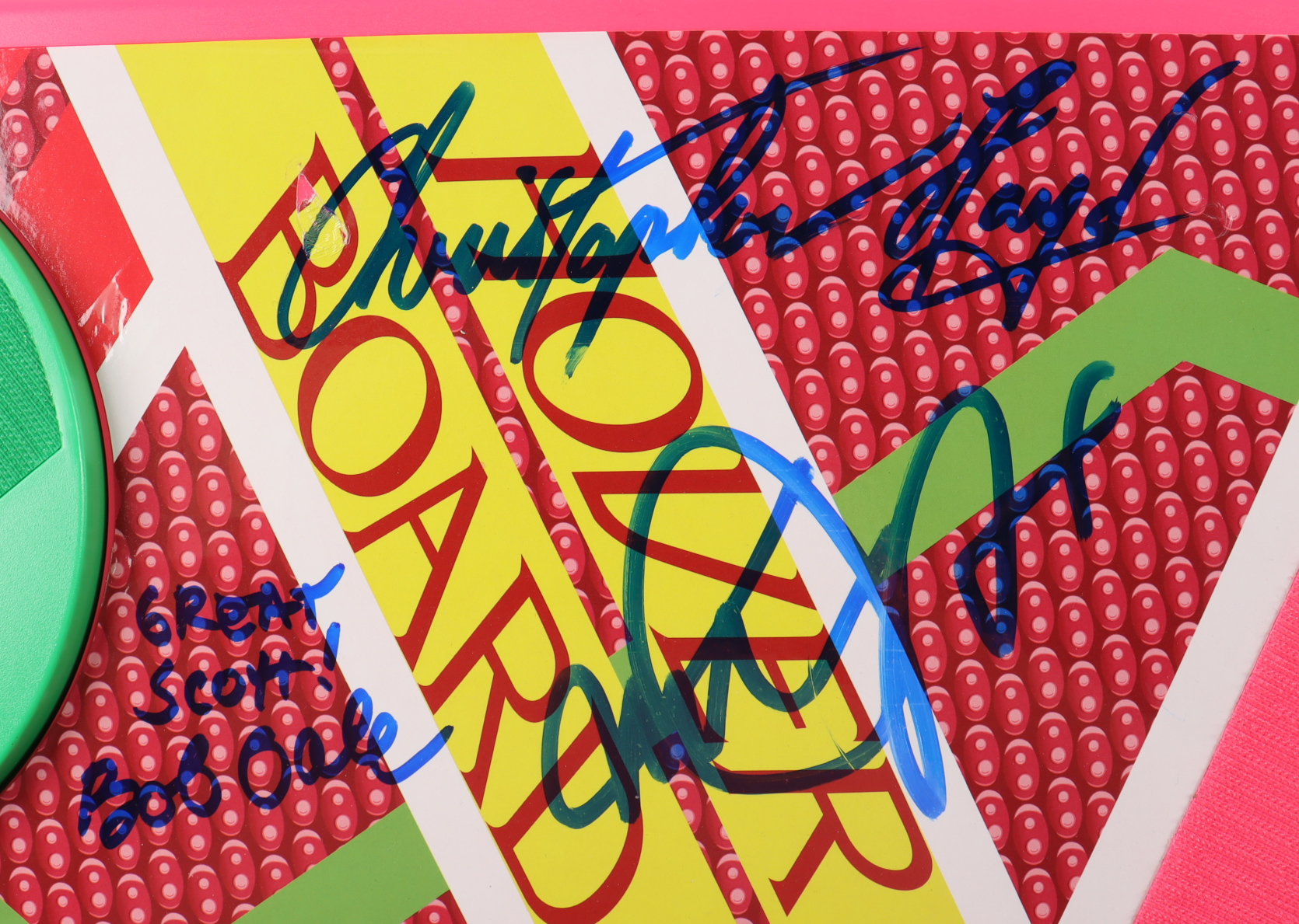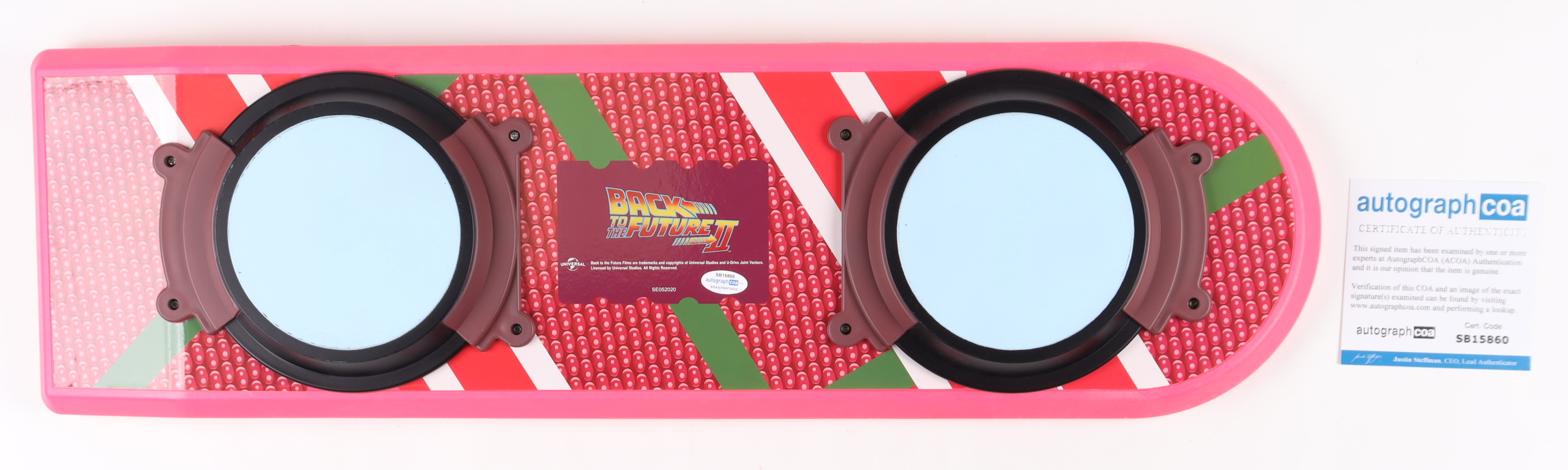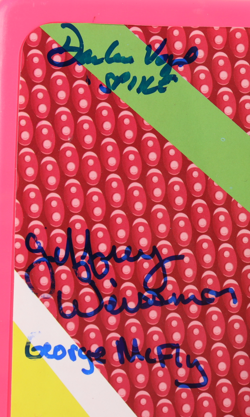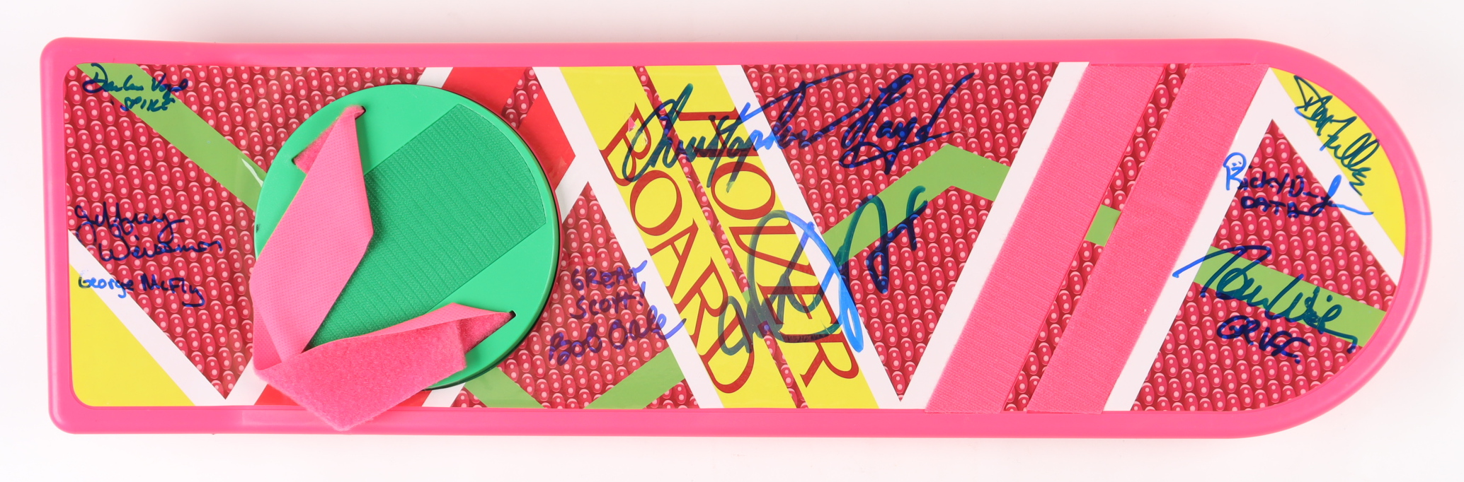 Full-size movie prop replica hoverboard measures approximately 28" long and has been hand-signed and inscribed by (8) including Michael J. Fox (Marty McFly), Christopher Lloyd (Emmett "Doc" Brown), Thomas F. Wilson (Biff Tannen), Donald Fullilove (Goldie Wilson), Bob Gale (Producer), Darlene Vogel (Leslie "Spike" O'Malley), Jeffrey Weissman (George McFly) and Ricky Dean Logan (Rafe "Data" Unger).