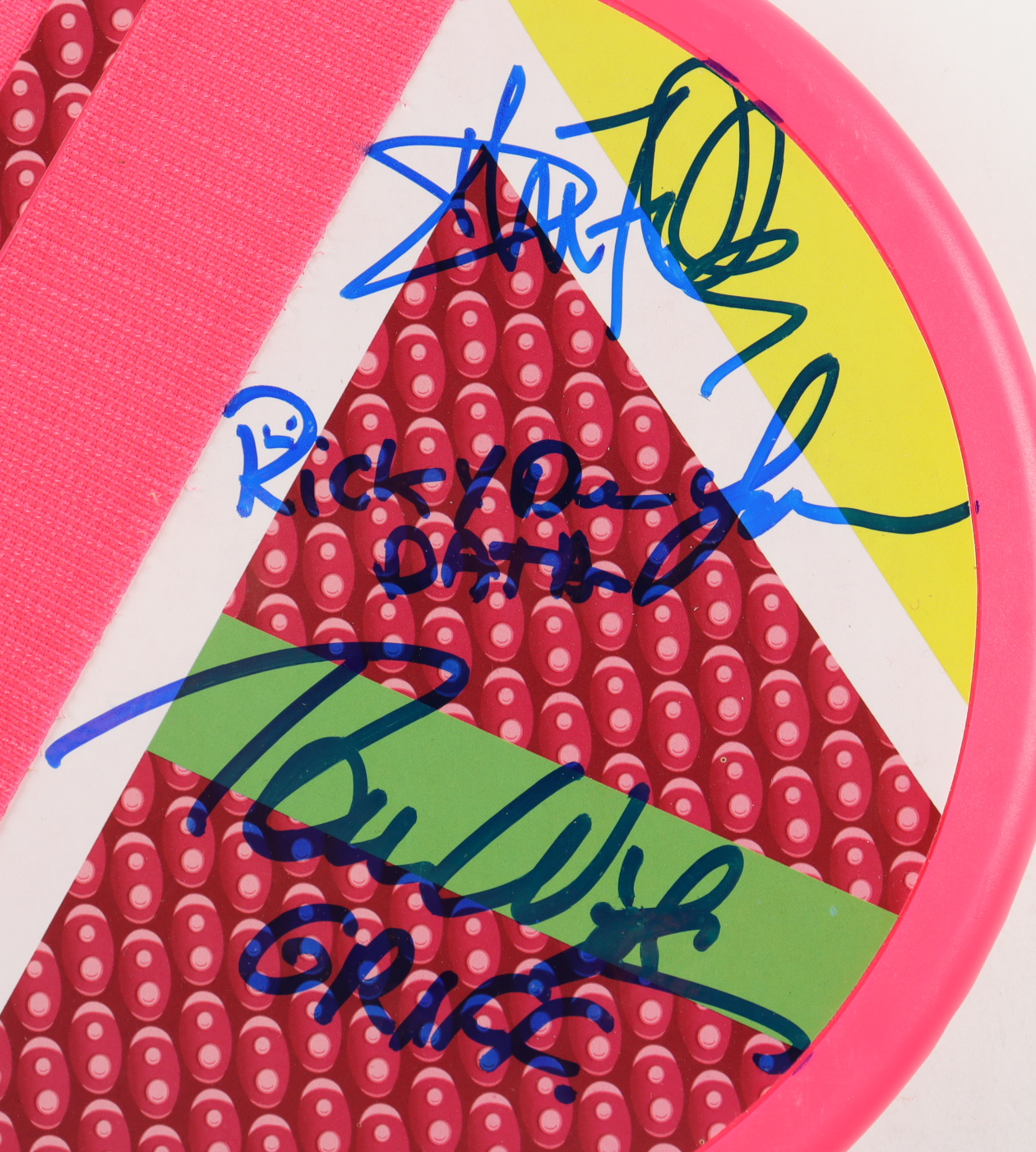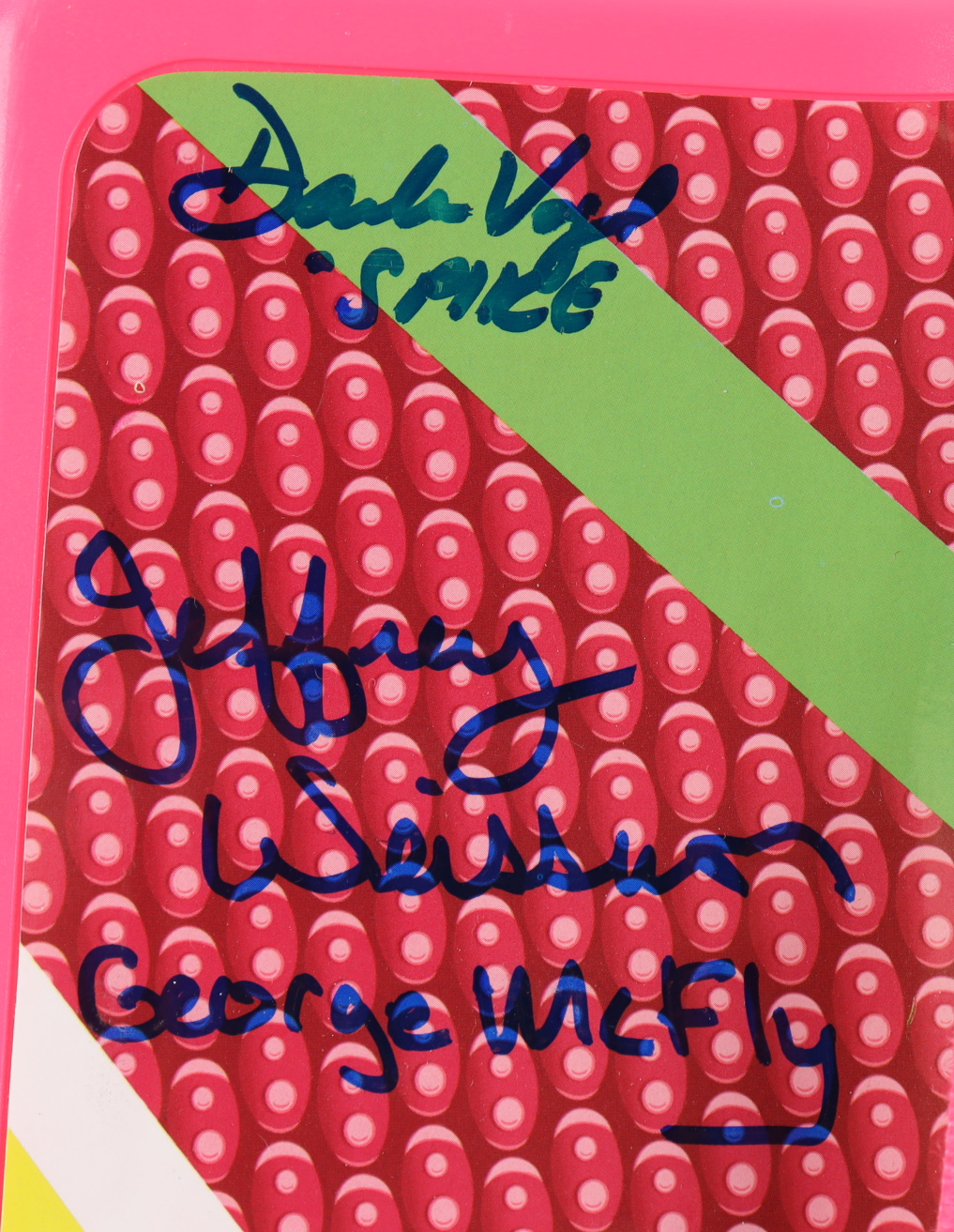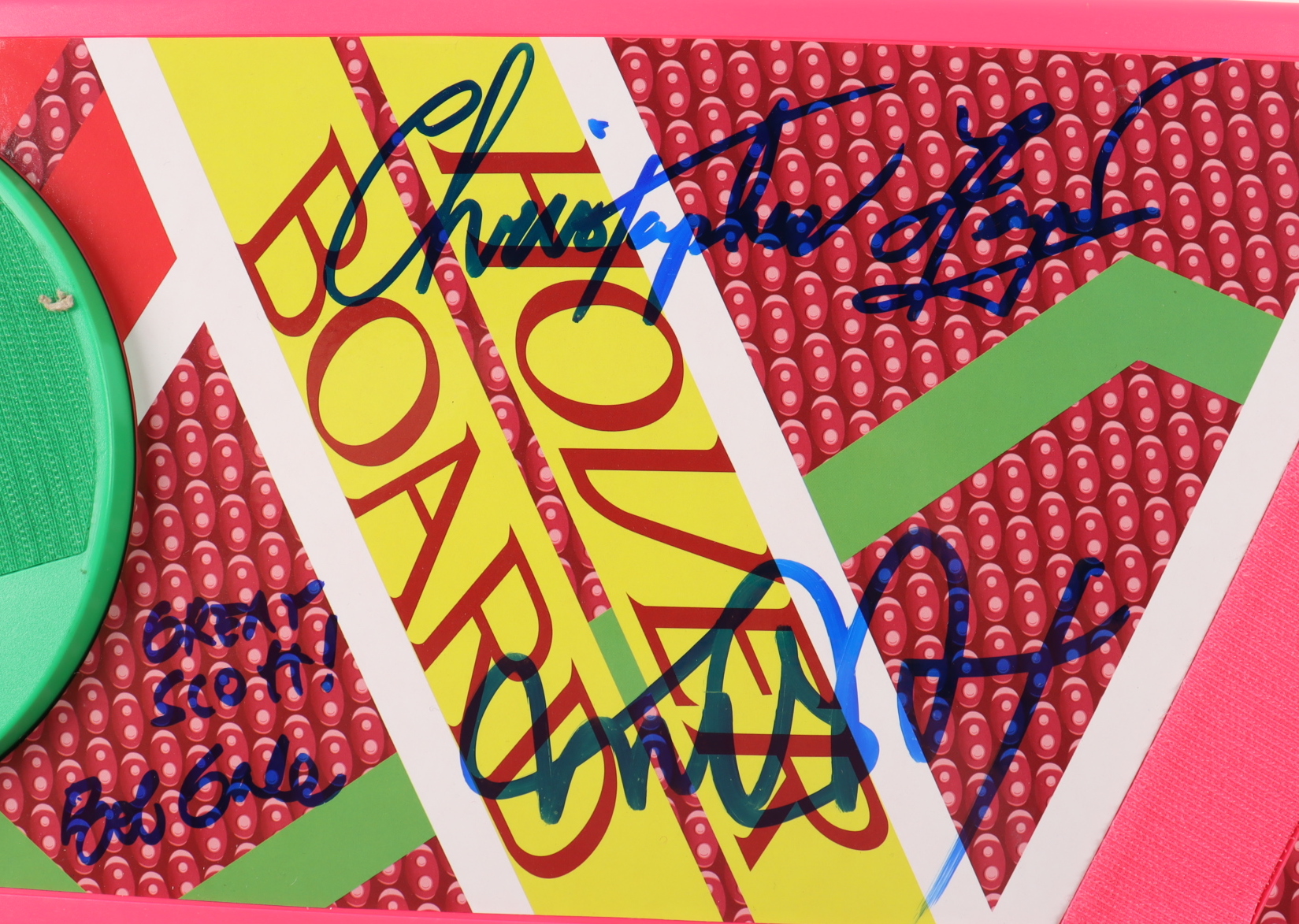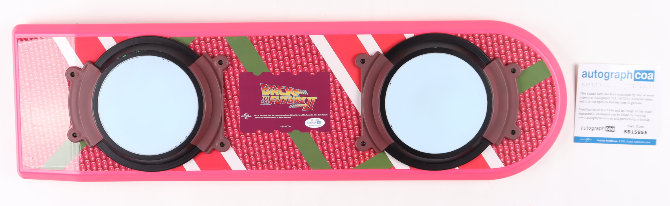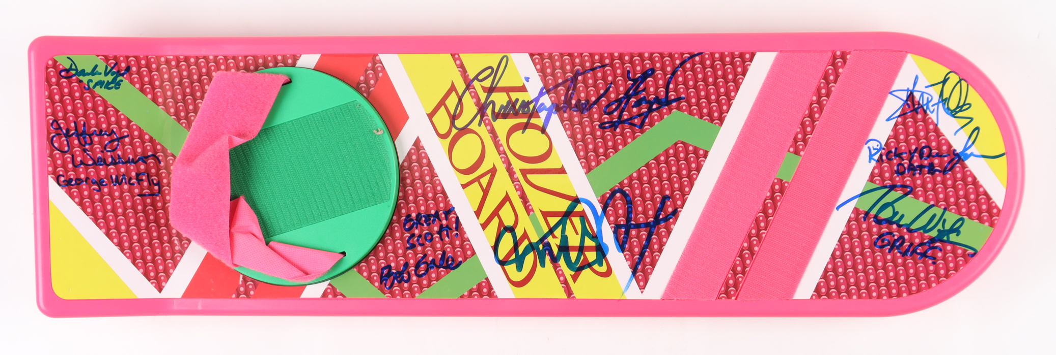 Full-size movie prop replica hoverboard measures approximately 28" long and has been hand-signed and inscribed by (8) including Michael J. Fox (Marty McFly), Christopher Lloyd (Emmett "Doc" Brown), Thomas F. Wilson (Biff Tannen), Donald Fullilove (Goldie Wilson), Bob Gale (Producer), Darlene Vogel (Leslie "Spike" O'Malley), Jeffrey Weissman (George McFly) and Ricky Dean Logan (Rafe "Data" Unger).