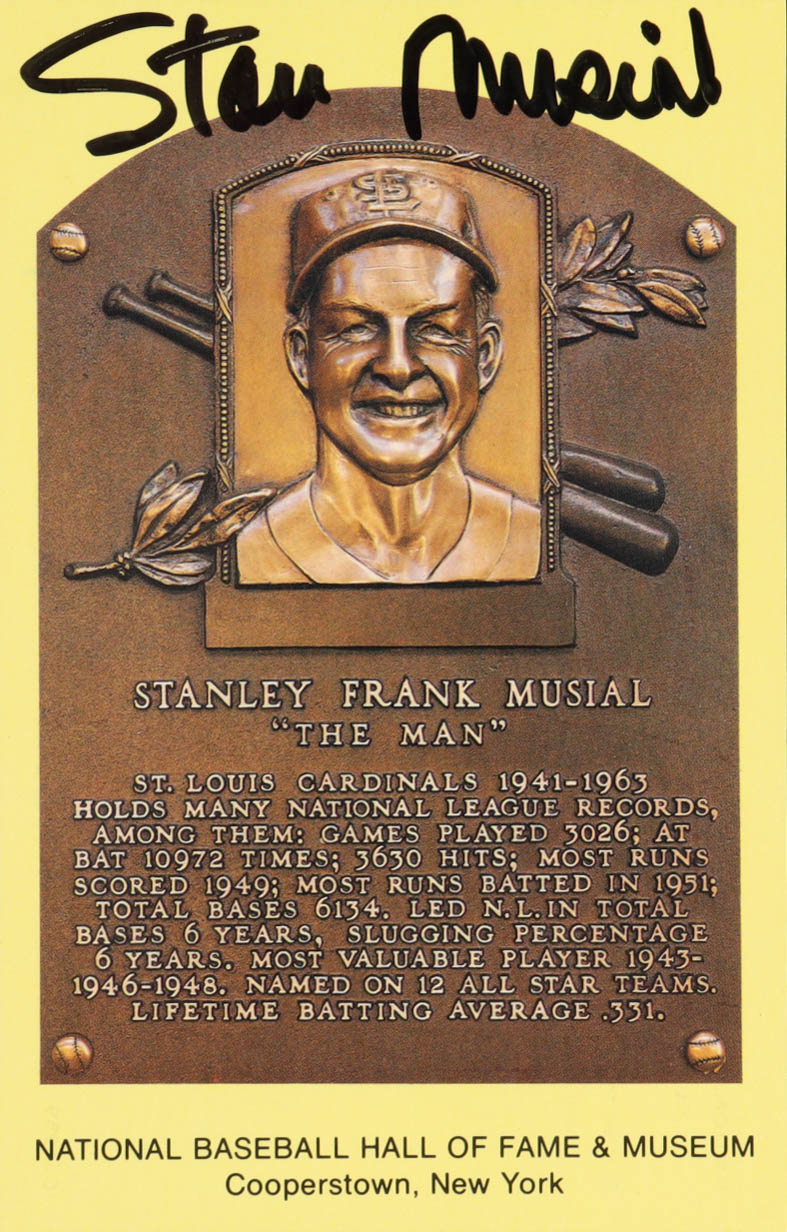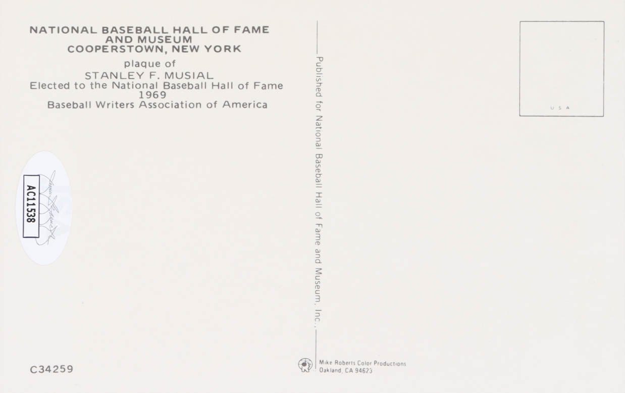 This original Hall of Fame postcard measures approximately 3.5" x 5.5" in size and is hand-signed by Stan Musial (D 2013). Please see the images for further details on the condition of the postcard.