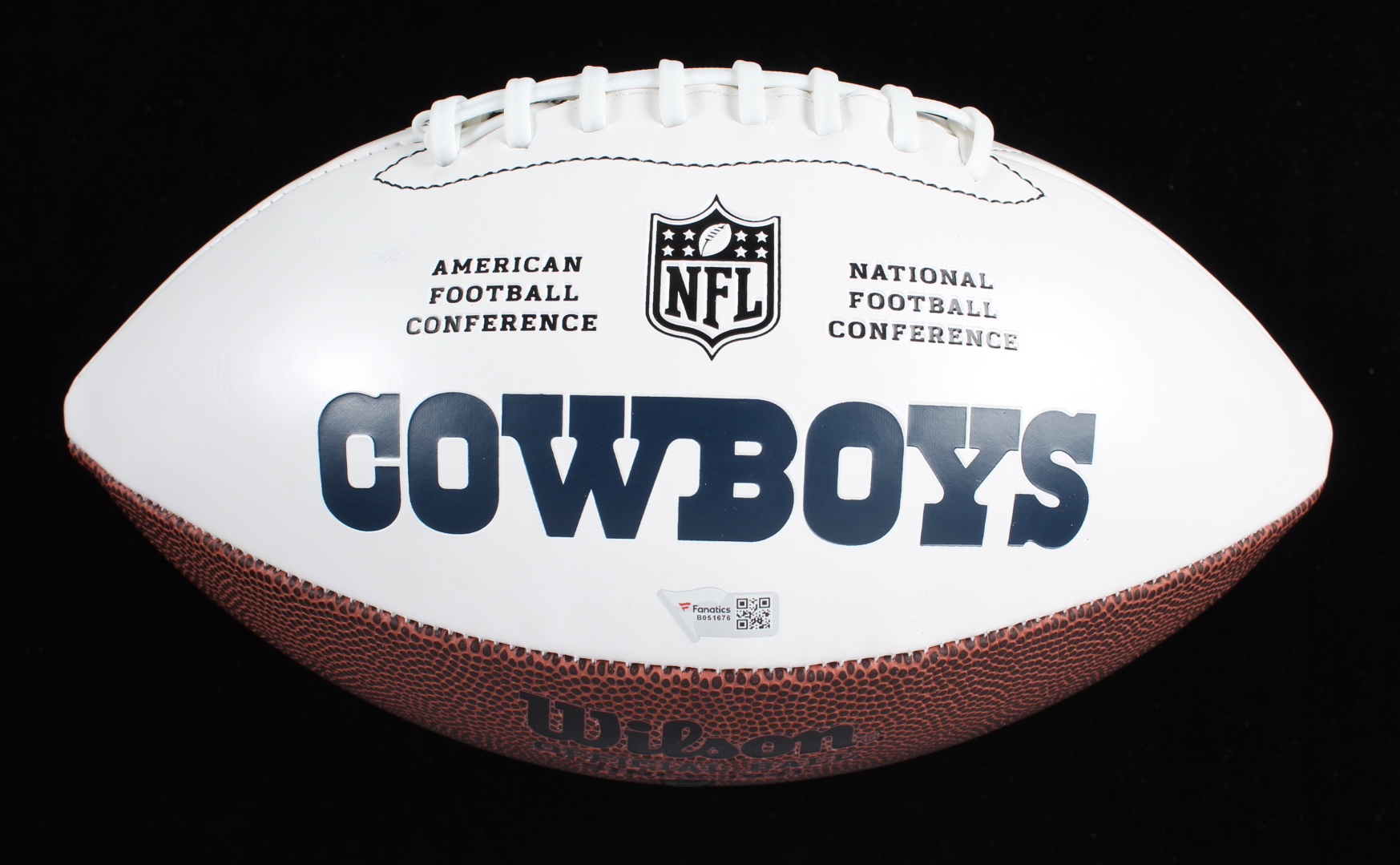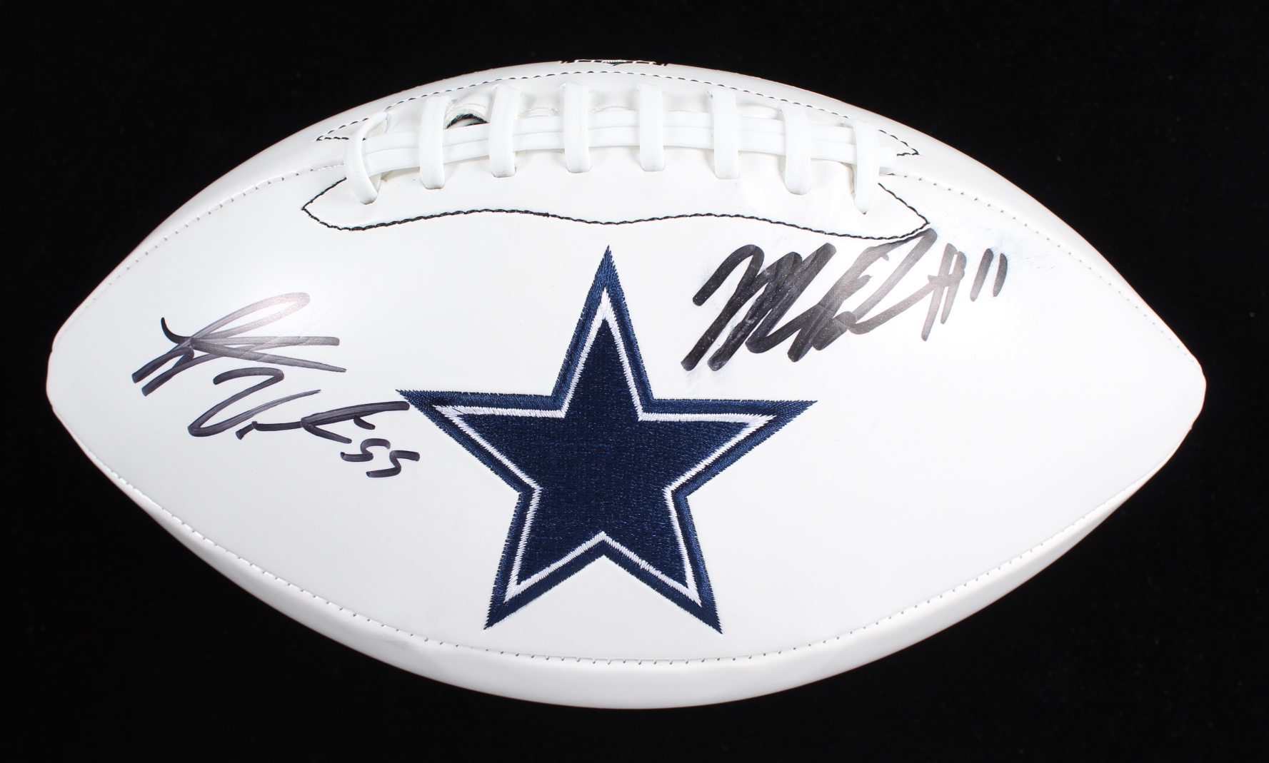 Wilson Dallas Cowboys logo football. Hand-signed by Leighton Vander Esch and Micah Parsons. Please note, Parsons' signature is smudged and there is staining on the blank white panel of the ball.