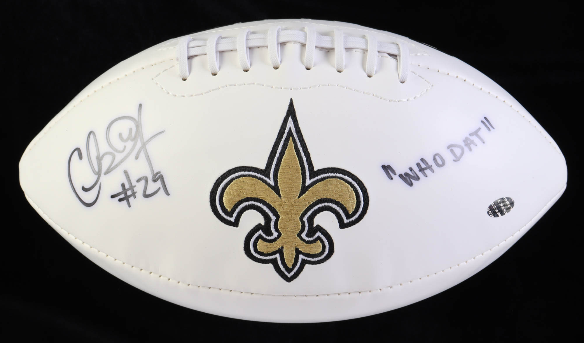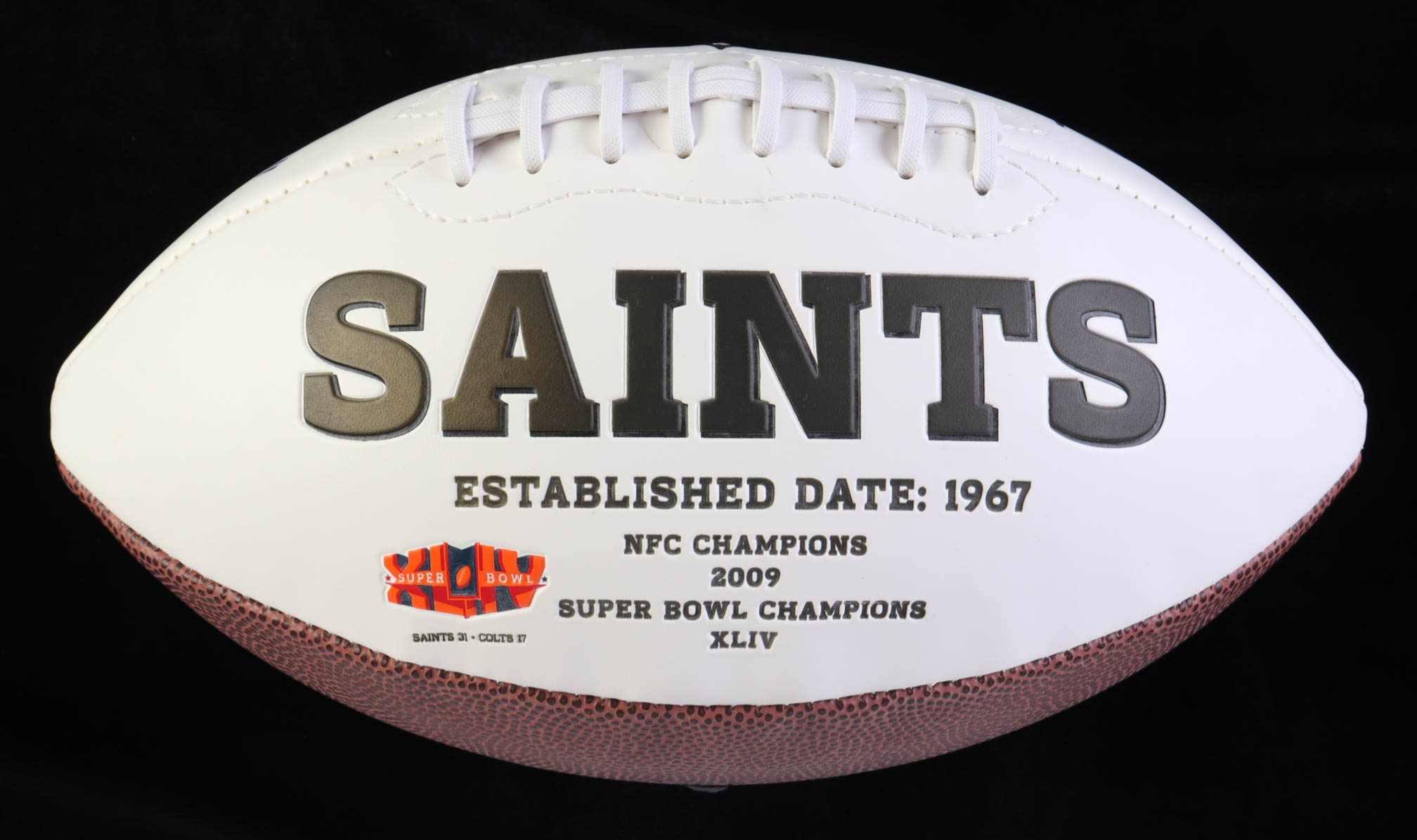 New Orleans Saints logo football. Hand-signed and inscribed by Chris Ivory.