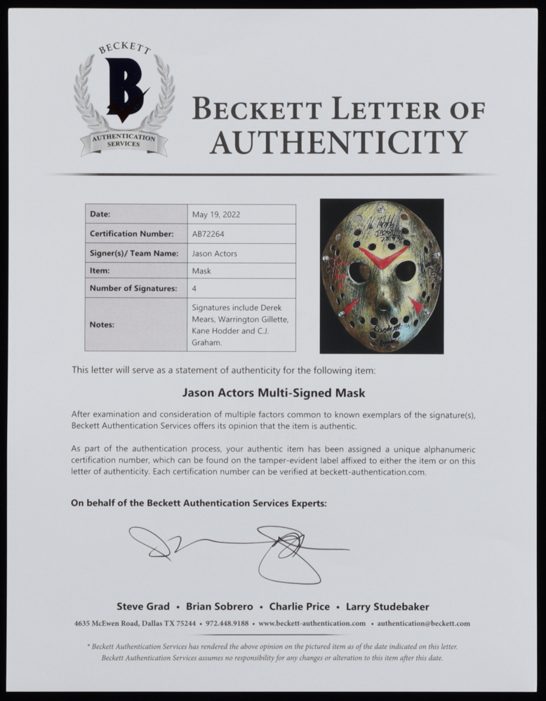 "Friday the 13th" Jason Mask Signed by (4) with Derek Mears, Warrington Gillette, Kane Hodder, & C. J. Graham with (4) Inscriptions (Beckett)