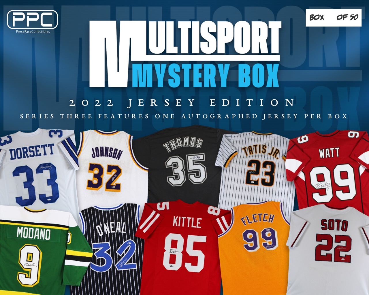 The Press Pass Collectibles 2022 multi-sport jersey mystery box includes one (1) custom jersey from one of four major sports, (NFL, NBA, MLB, NHL). Some Boxes will feature jerseys signed by Tony Dorsett, Magic Johnson, Frank Thomas, Fernando Tatis Jr., J.J. Watt, Chevy Chase, and many more!