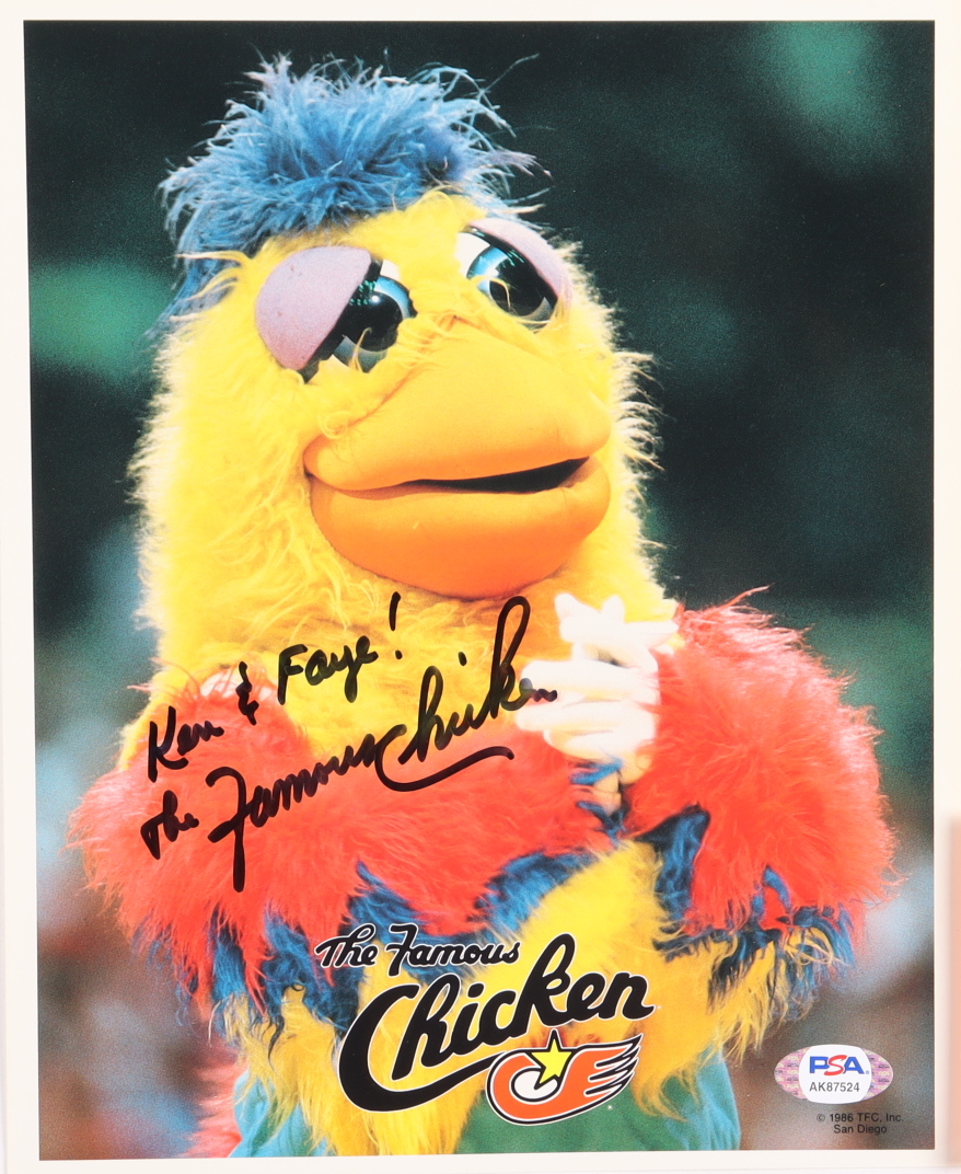 Photo measures 8" x 10" in size and has been hand-signed by Ted Giannoulas (San Diego Chicken). Please note, the photo is signed in the character's name and has been personalized "Ken & Faye!"