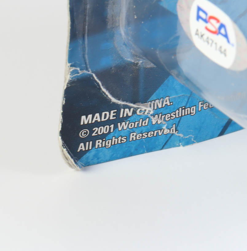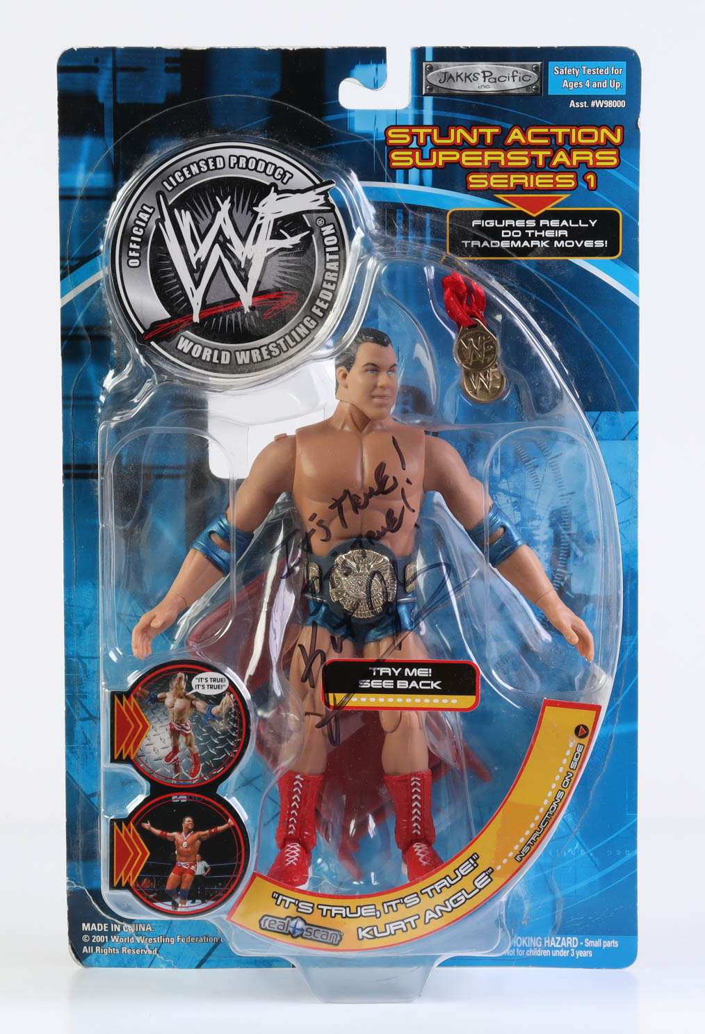 WWF action figure measures approximately 6" tall and has been hand-signed and inscribed on the packaging by Kurt Angle (HOF). Includes original packaging as shown. Please note, the bottom left corner is torn and worn.