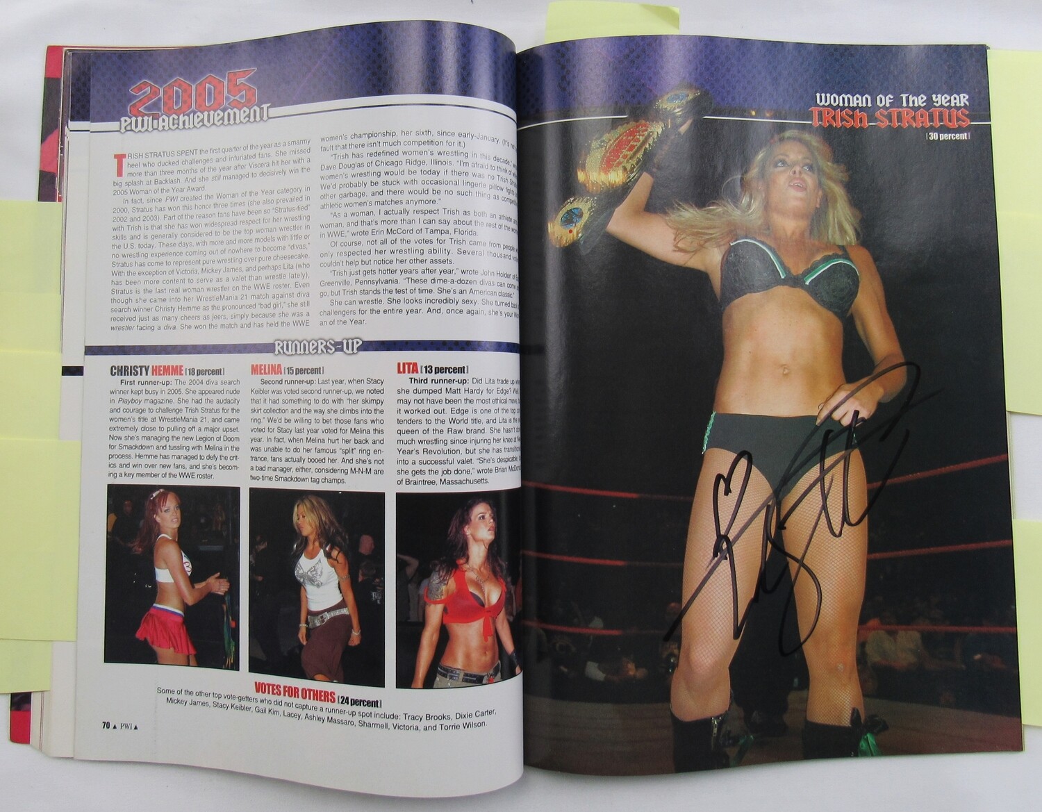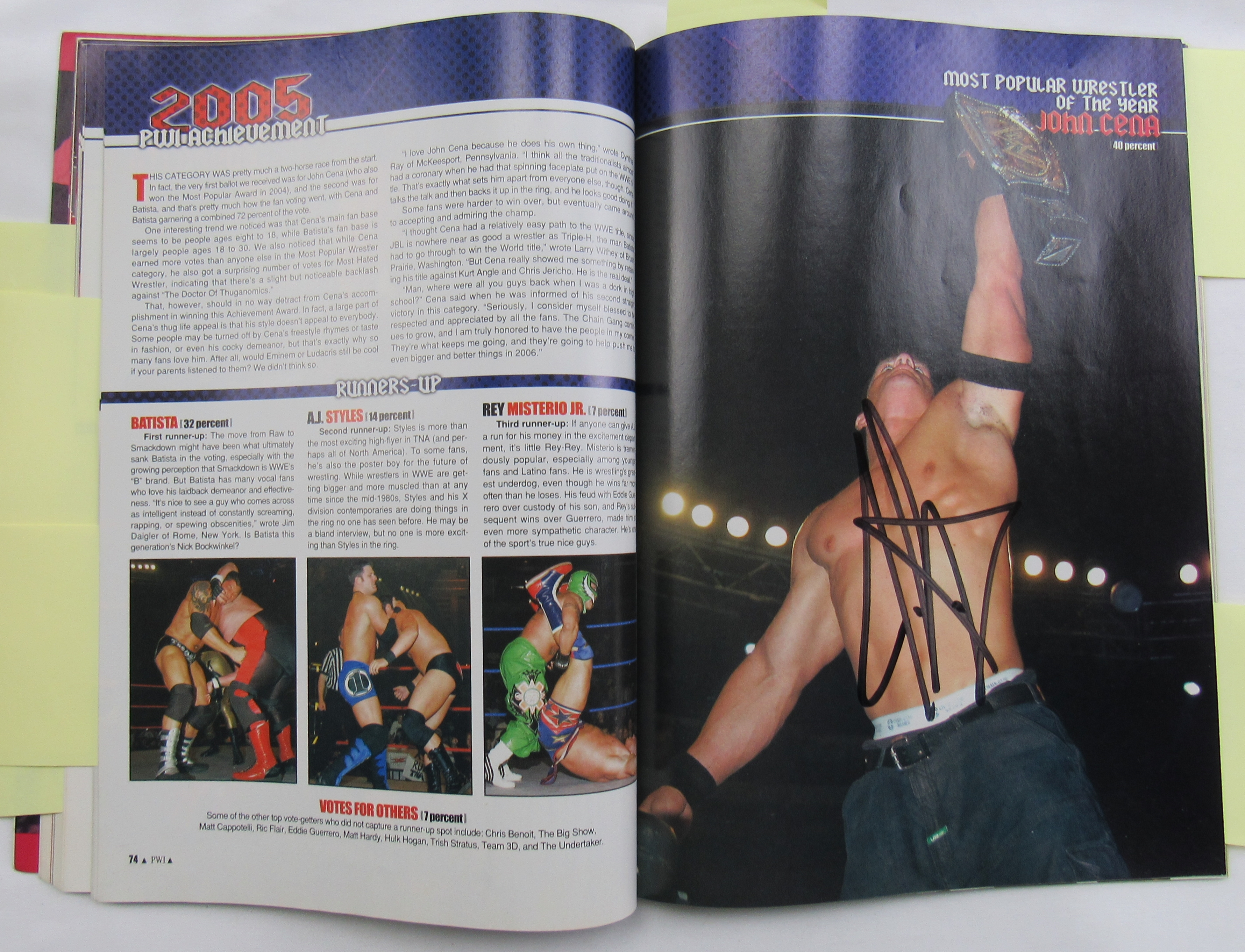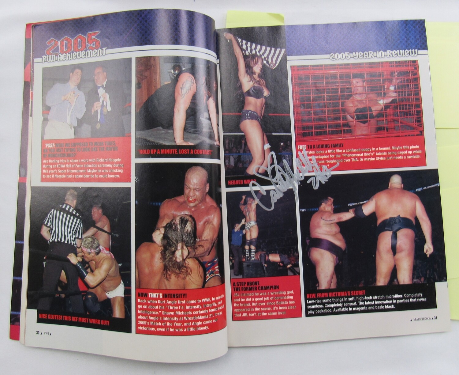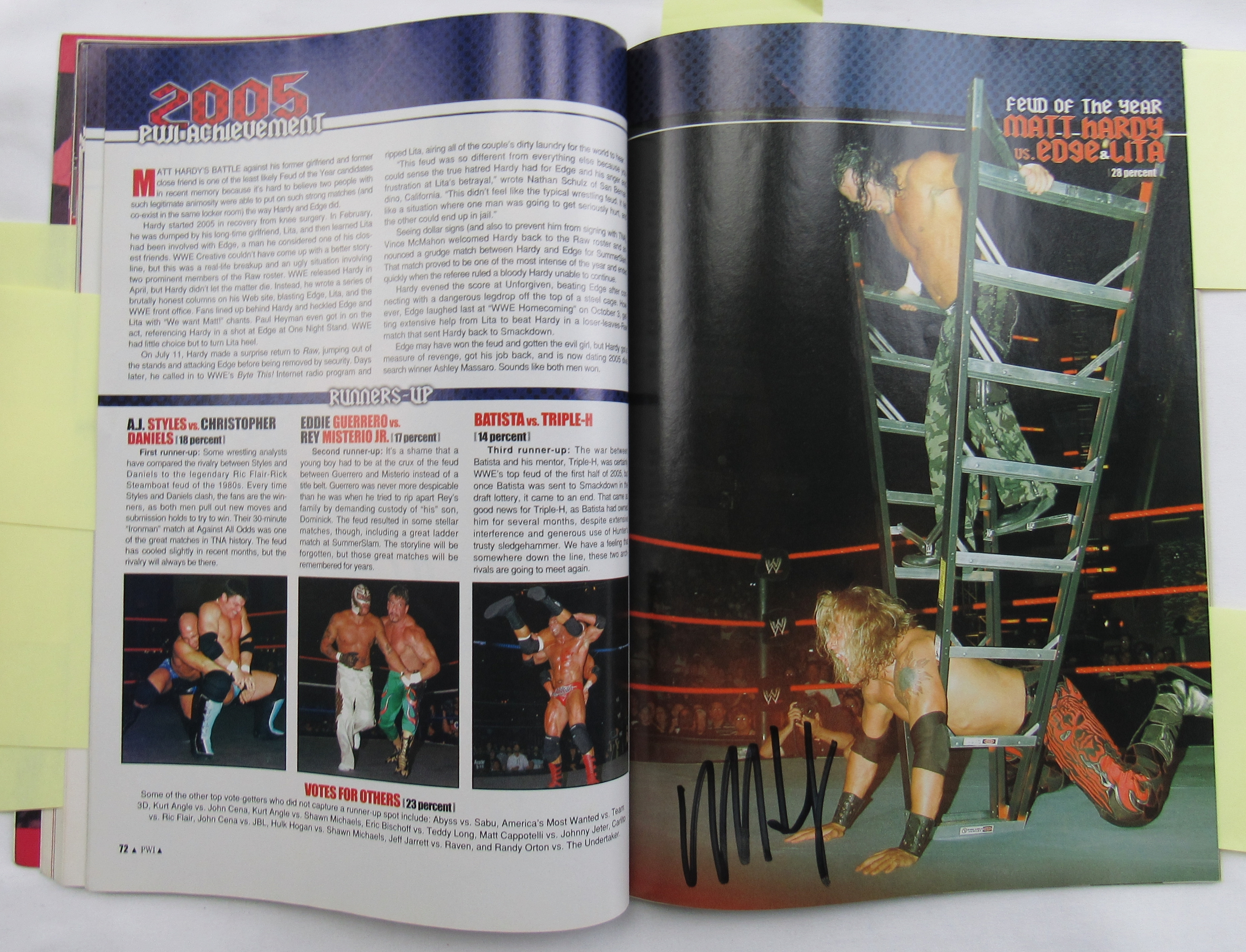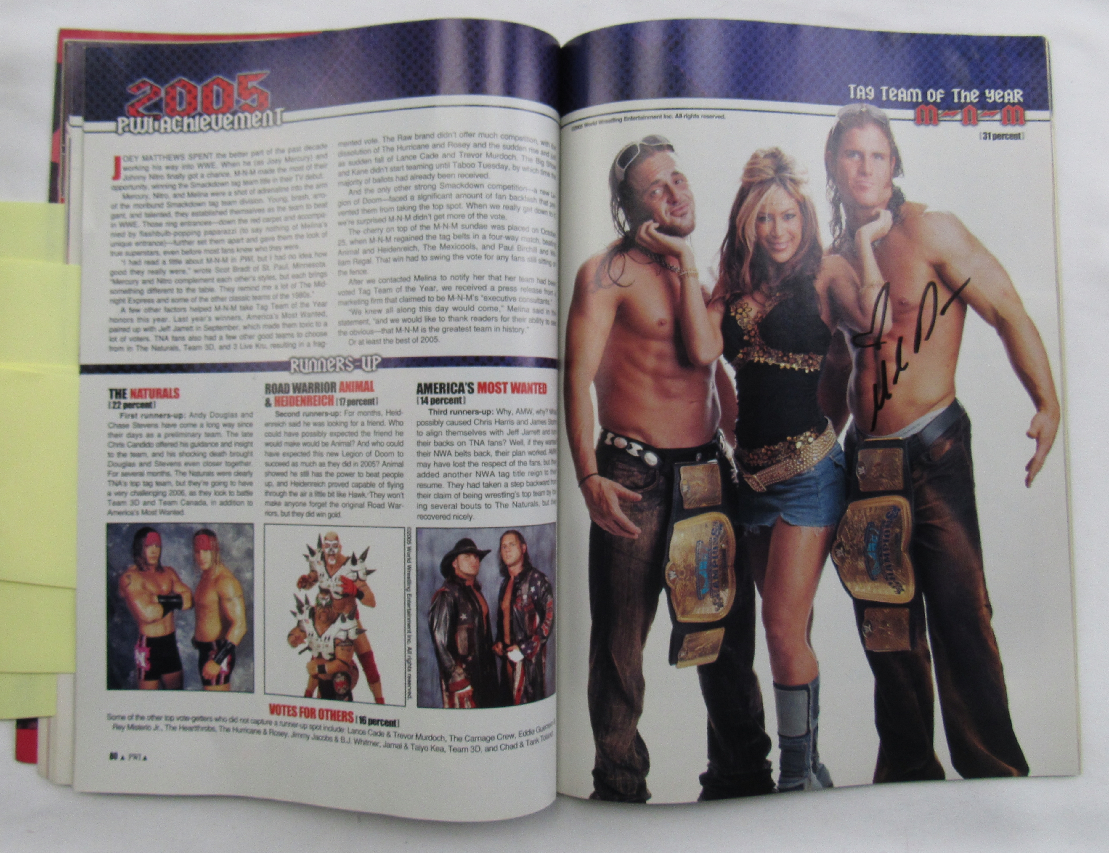 Magazine has been hand-signed by (11) including Batista, Candice Michelle, CM Punk, Ashley Massaro, Bobby Lashley, Trish Stratus, Matt Hardy, John Cena, Melina (2x) and Kurt Angle.