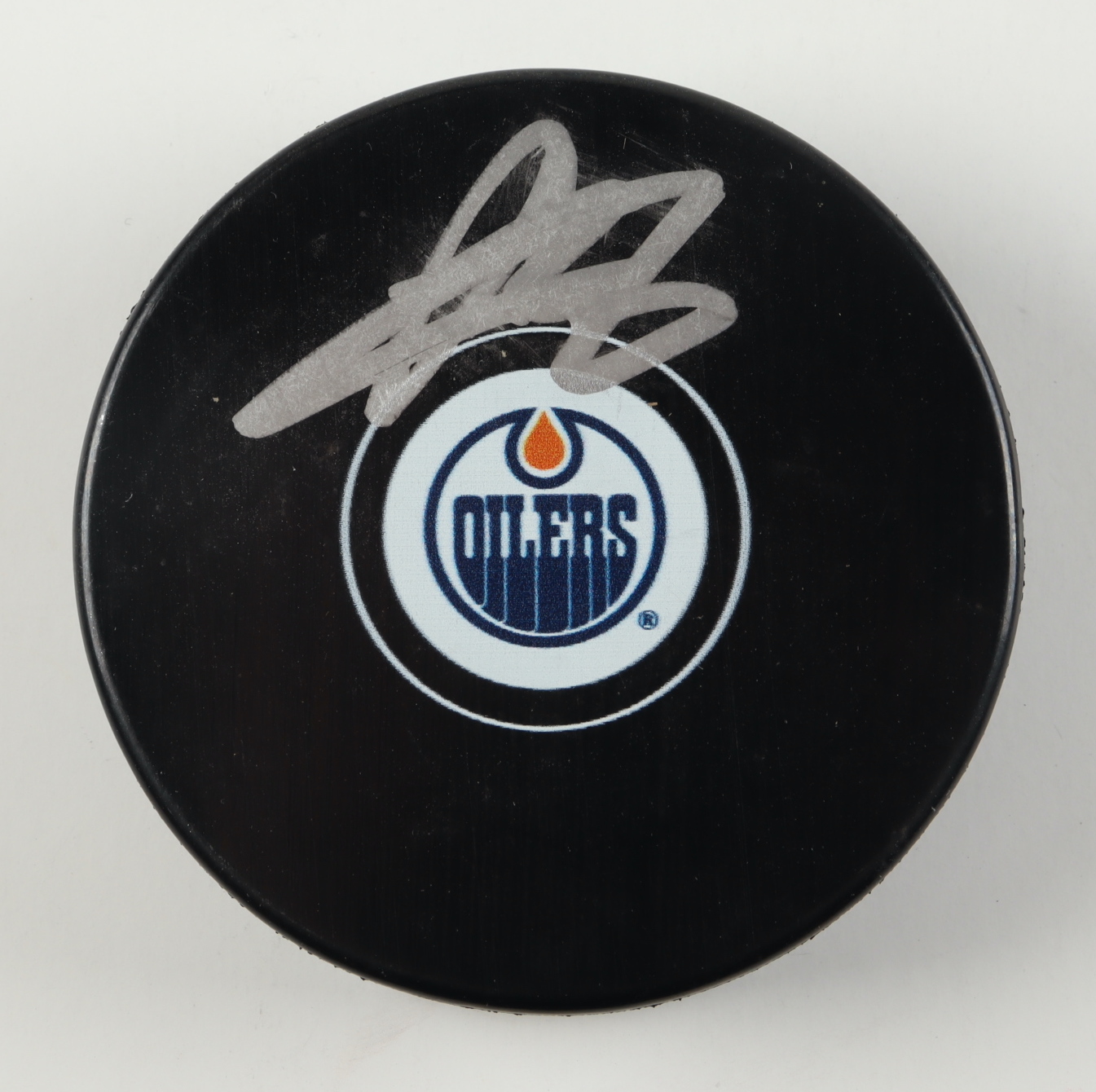 Edmonton Oilers Logo hockey puck. Hand-signed by Adam Larsson.