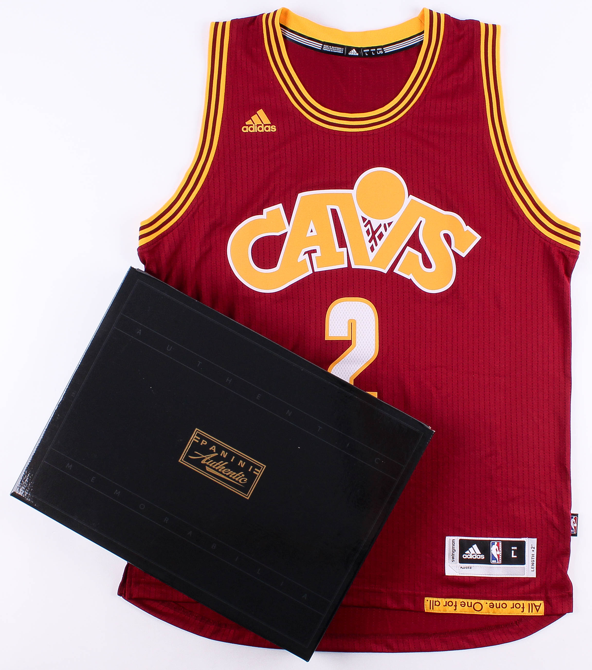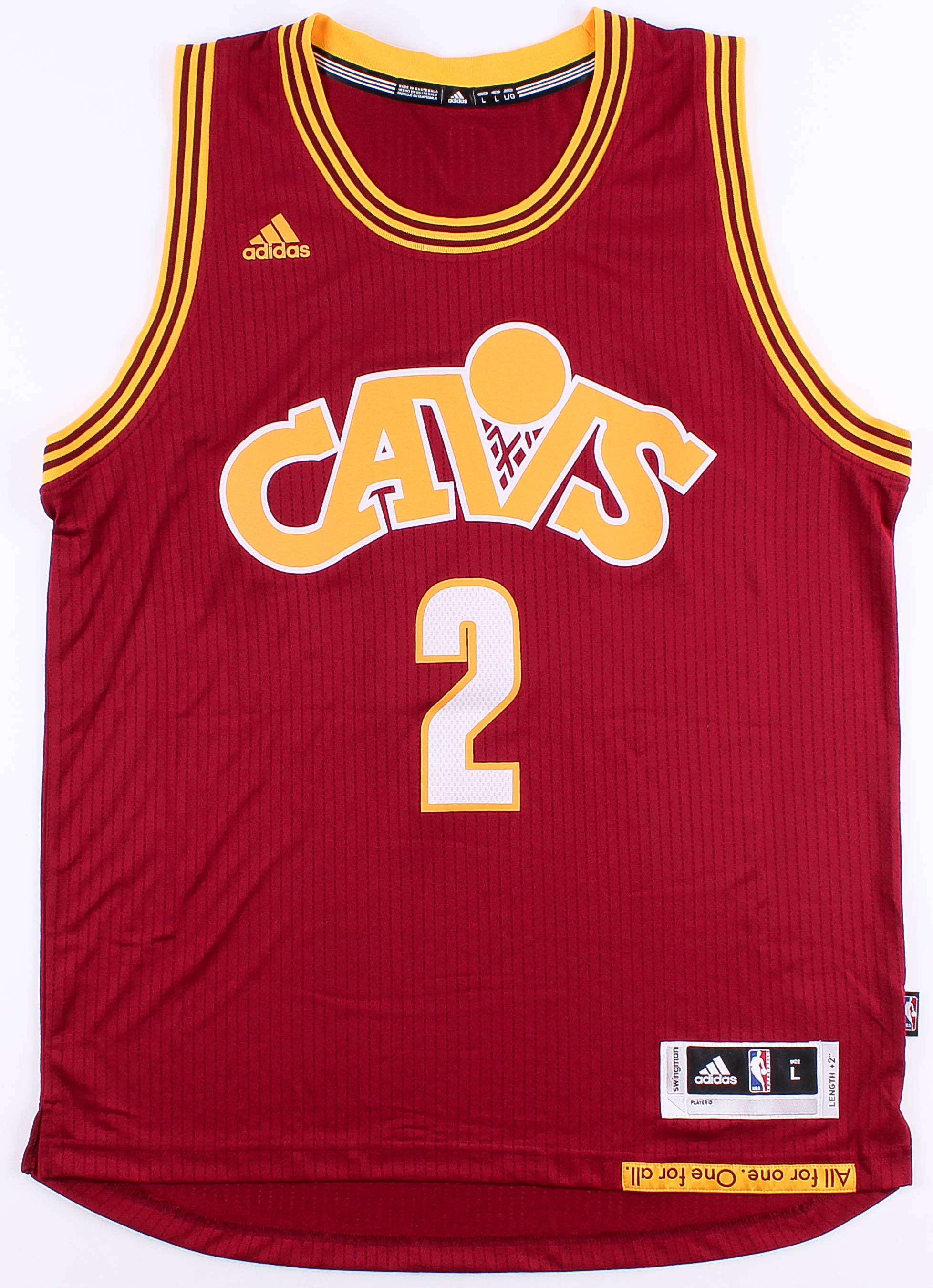 Adidas on-court style jersey. Everything silk-screened on, size L. Hand-signed and inscribed in black felt-tip pen by Kyrie Irving. Jersey is limited edition and has been hand-numbered #1/122.