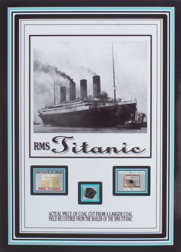 Photo measures approximately 6" x 8" in size. Features a piece of coal recovered from the Titanic. Please note, the coal has been glued onto the photo.