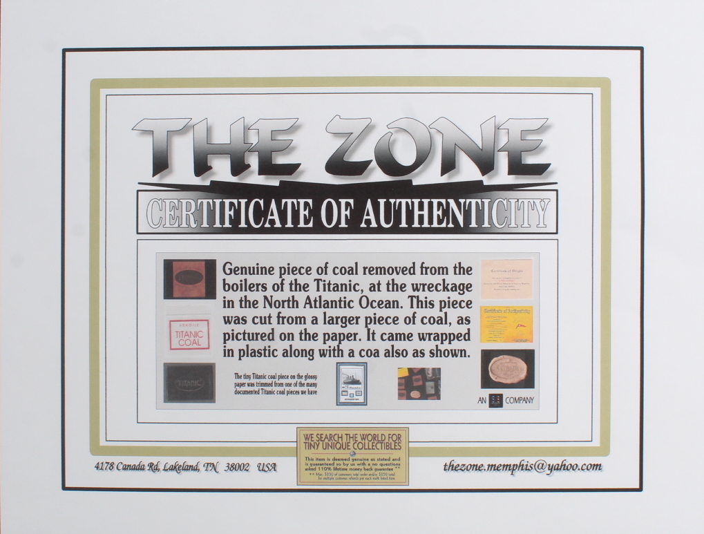 Authentic Coal From Titanic Wreckage on 6x8 Photo (The Zone)