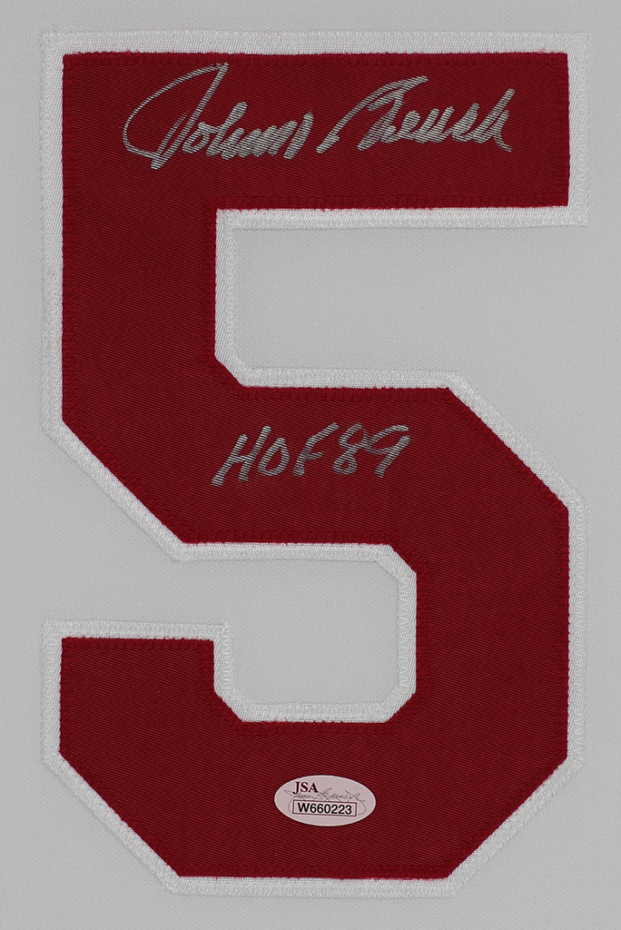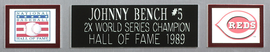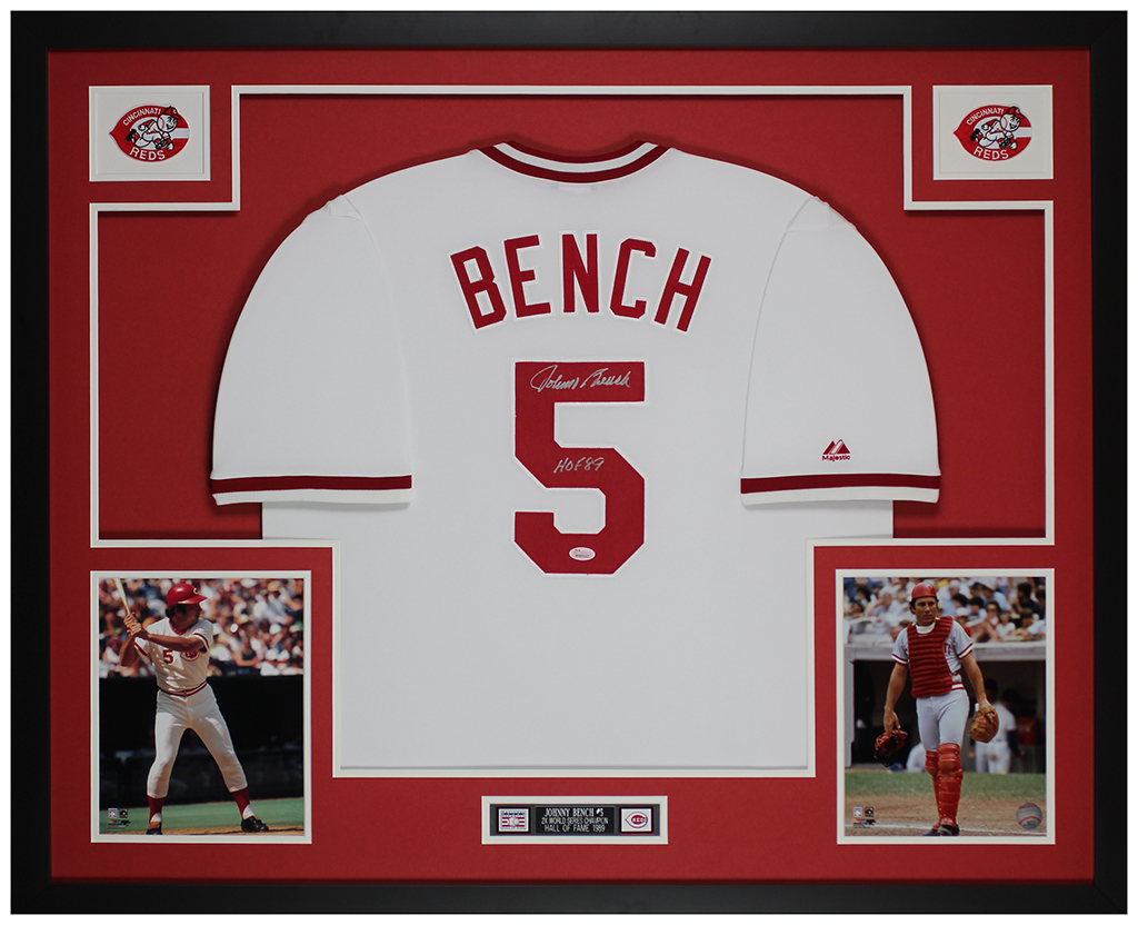 Custom frame measures approximately 35" x 43" in size and features a jersey hand-signed and inscribed by Johnny Bench (HOF).