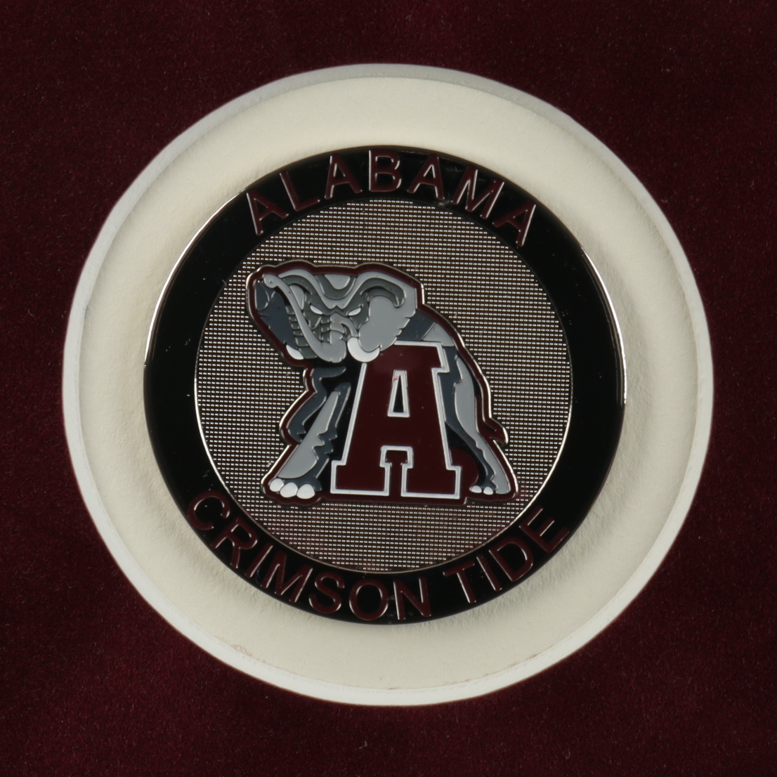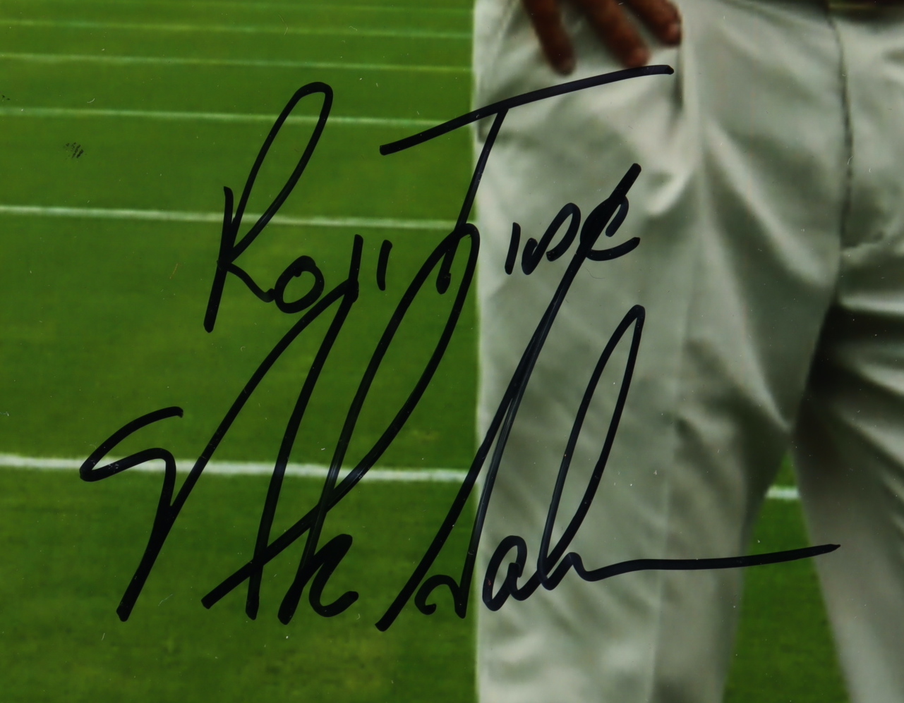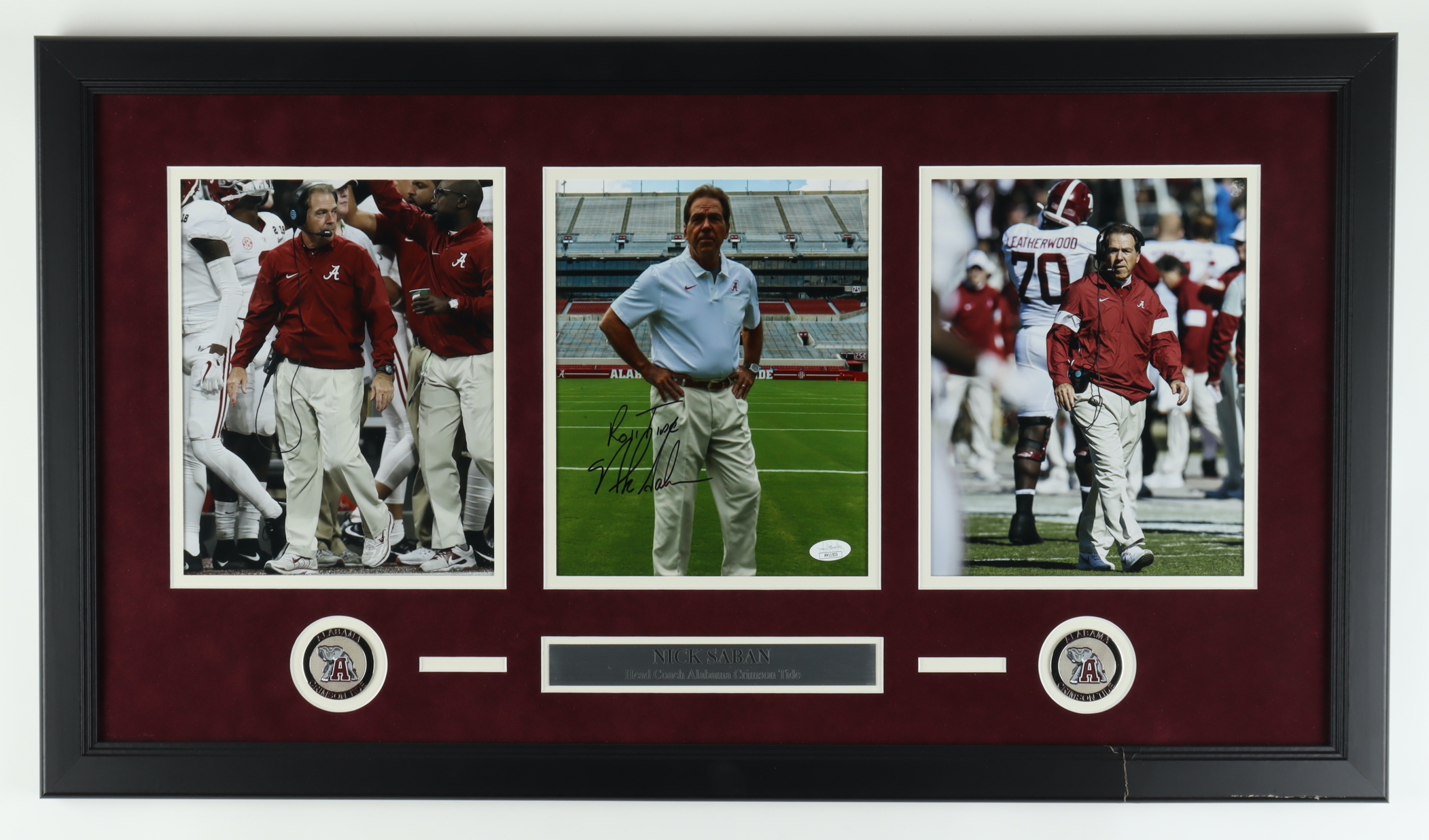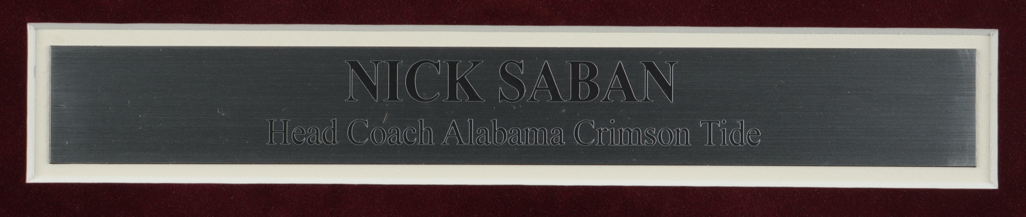Custom frame measures approximately 16" x 32" in size and features an 8" x 10" photo that has been hand-signed and inscribed by Nick Saban. Display also features (2) 8" x 10" photos as well as a custom Nick Saban name plate. Please note that frame shows signs of wear on bottom right corner.