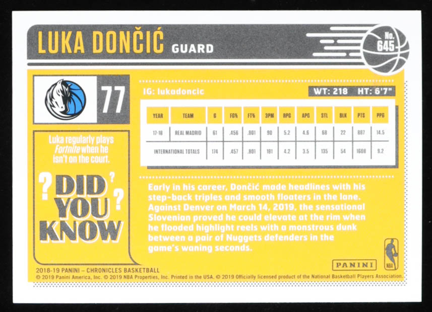 Luka Doncic 2018-19 Panini Chronicles Classics #645 RC