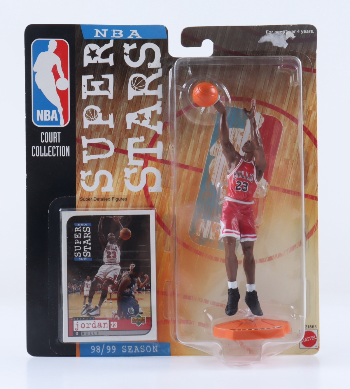 Mattel NBA Superstars Michael Jordan action figure measures approximately 6" in height. Includes 1998-99 Mattel NBA Superstars #14 White.