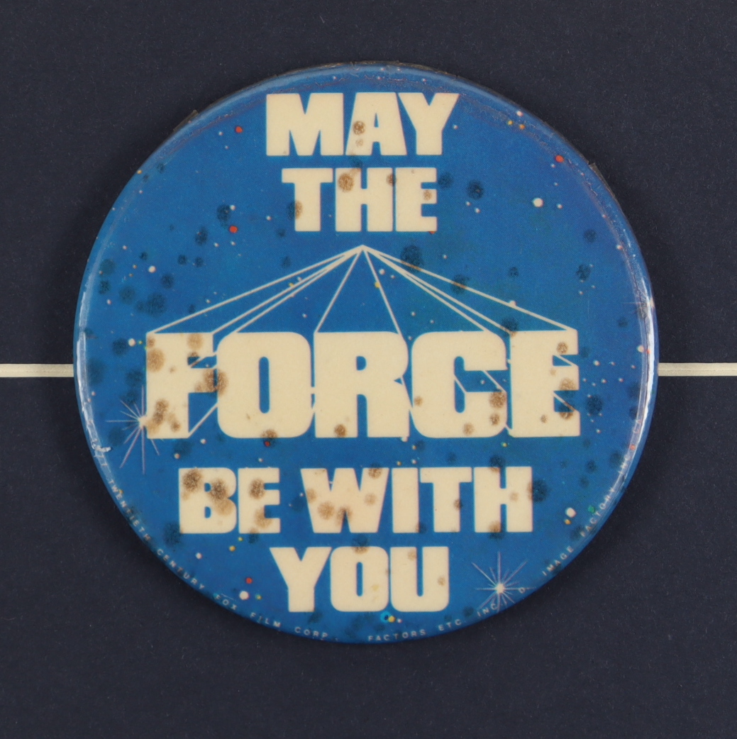 Custom frame measures 12" x 18" in size and features an Israeli photo from the film "Star Wars" and a vintage Star Wars pin.