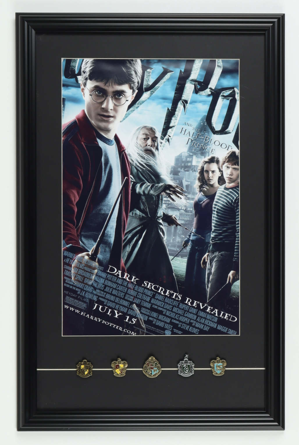Custom frame measures 16" x 25" in size and features a photo of "Harry Potter and the Half-Blood Prince". Display also features (5) Harry Potter pins.