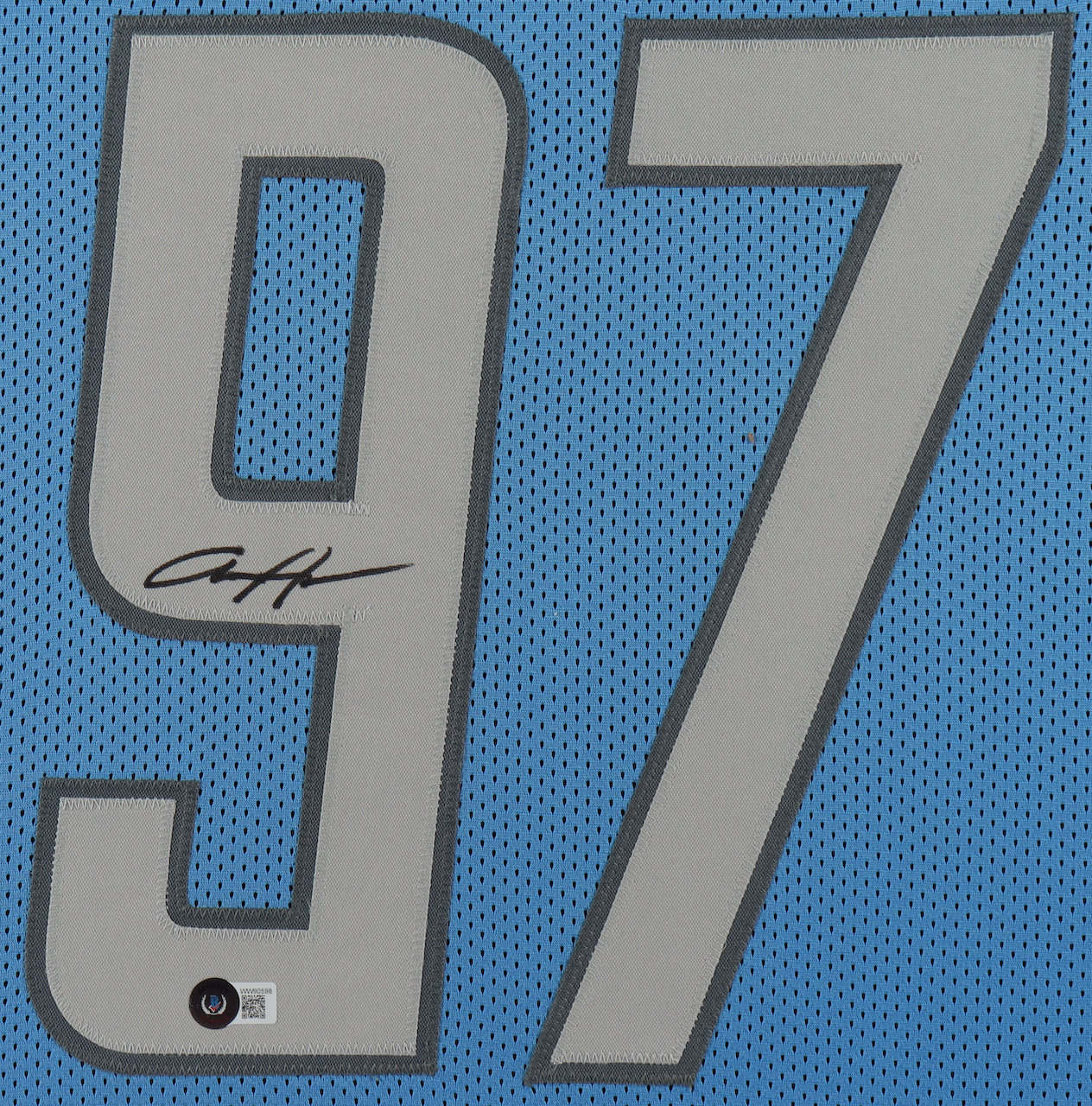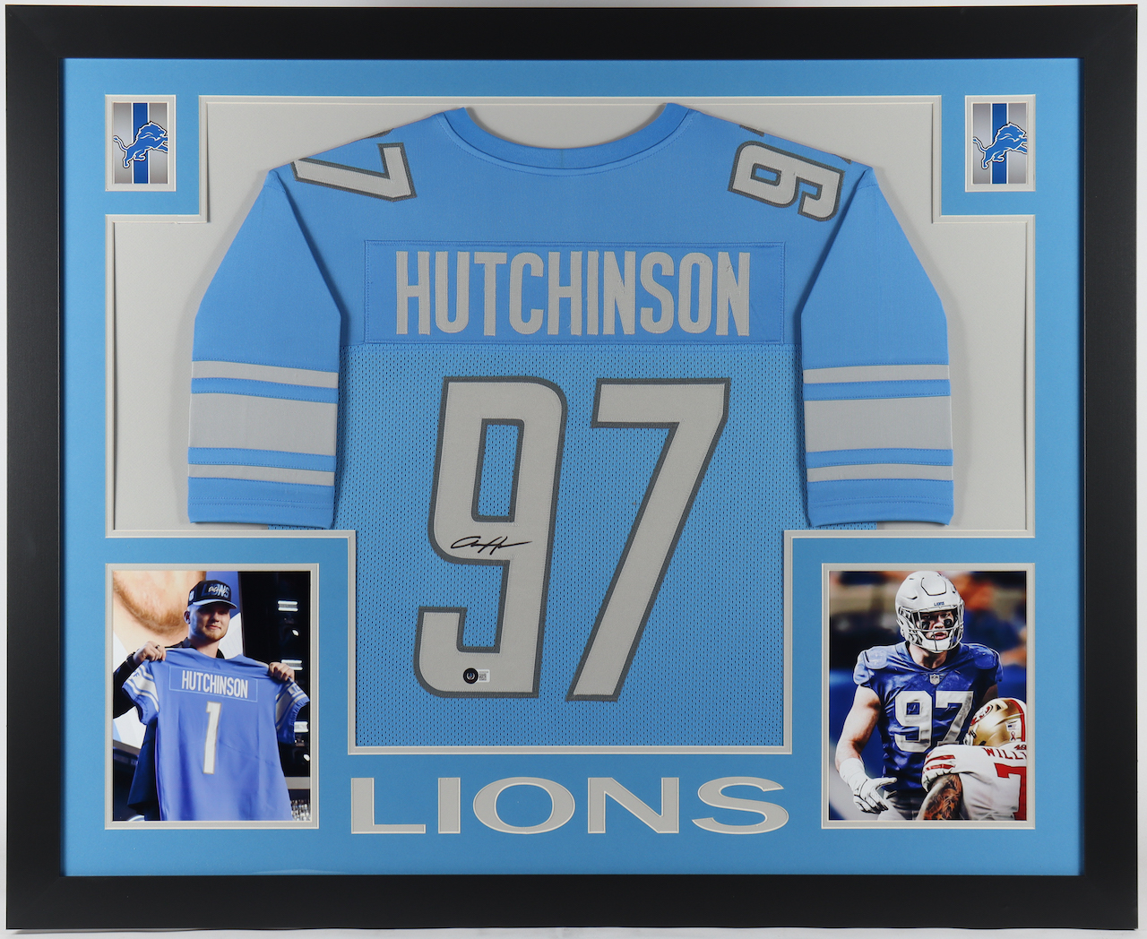 Custom frame measures 35" x 43" in size and features a jersey that has been hand-signed by Aidan Hutchinson.