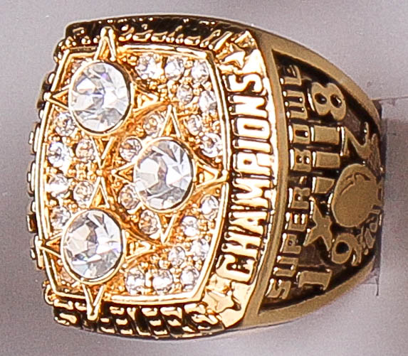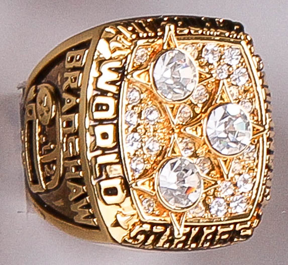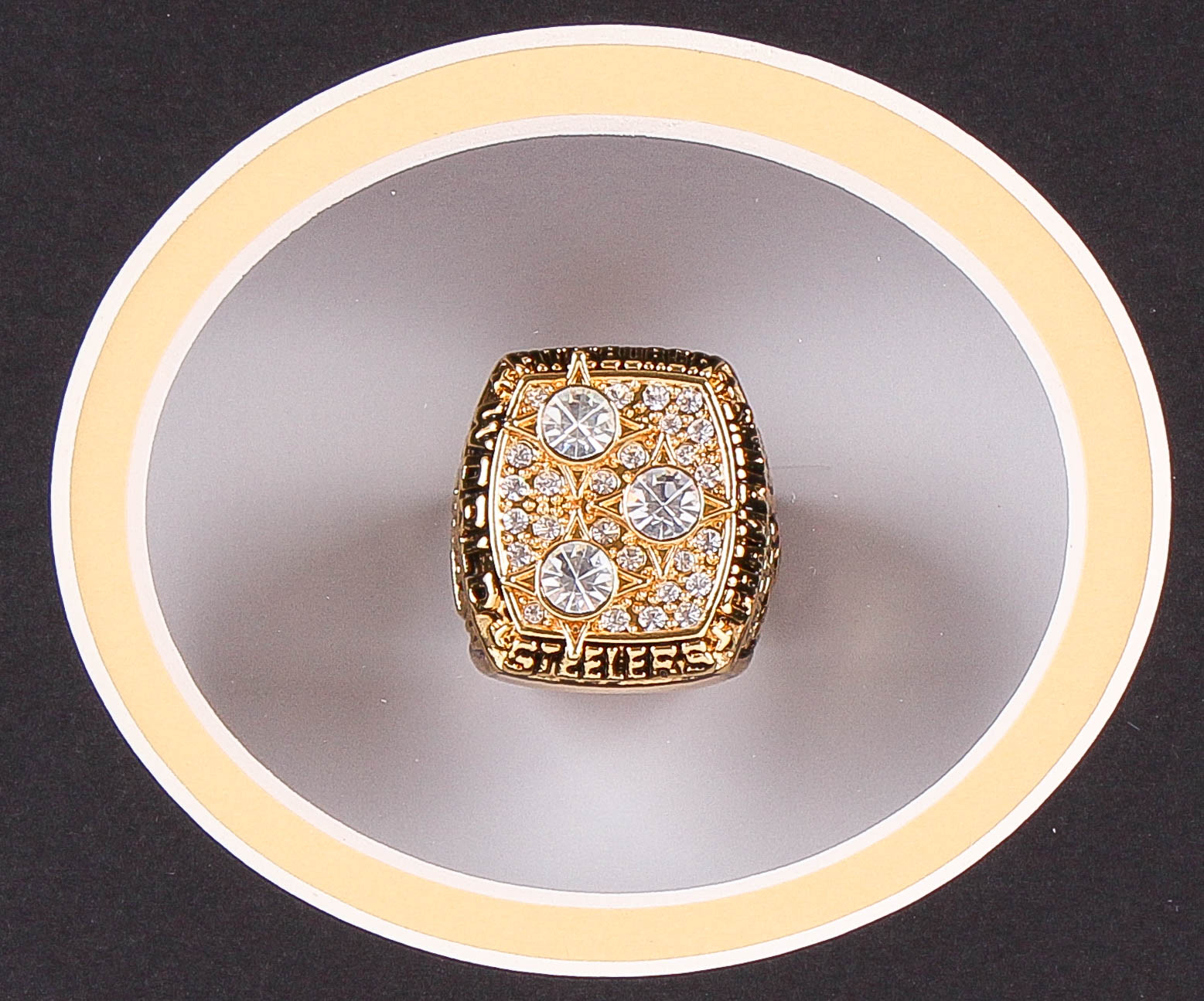 Custom framed championship ring display measures 13.5" x 21.5" in size and features a Terry Bradshaw Pittsburgh Steelers High Quality Replica Super Bowl XIII Championship Ring. The display also contains an 8" x 10" photo of Terry Bradshaw. Please note, display is unsigned. See photos for details.
