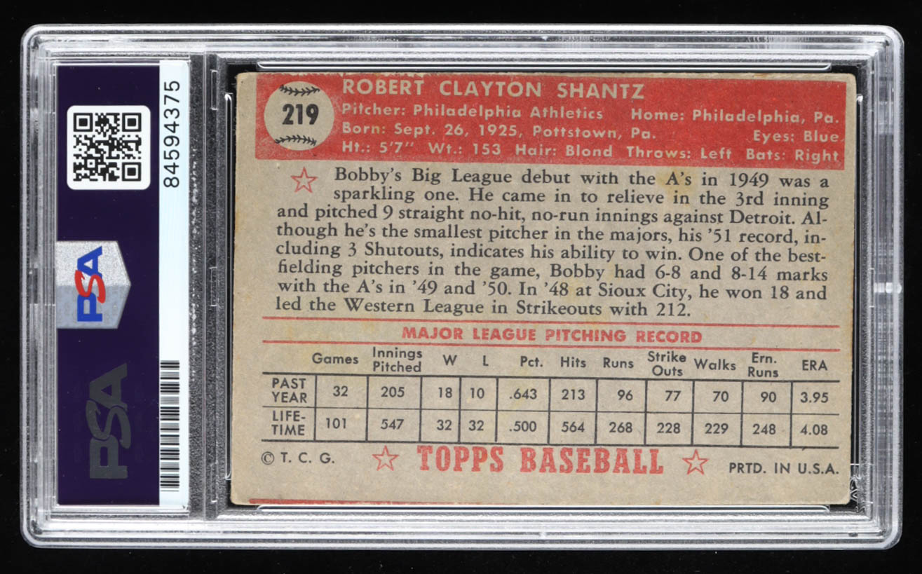 Bobby Shantz Signed 1952 Topps #219 Inscribed "1952 A.L. M.V.P." (PSA)