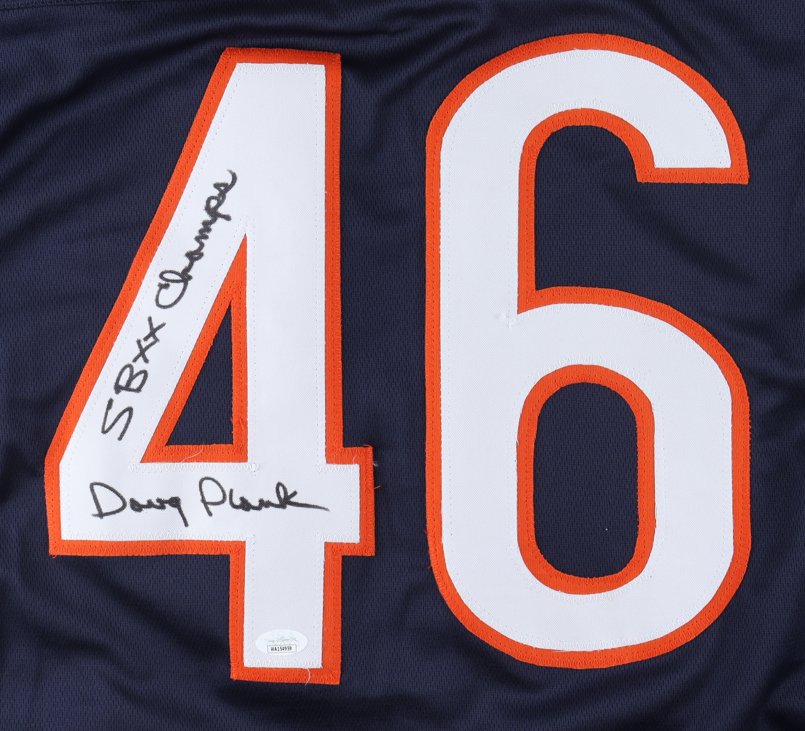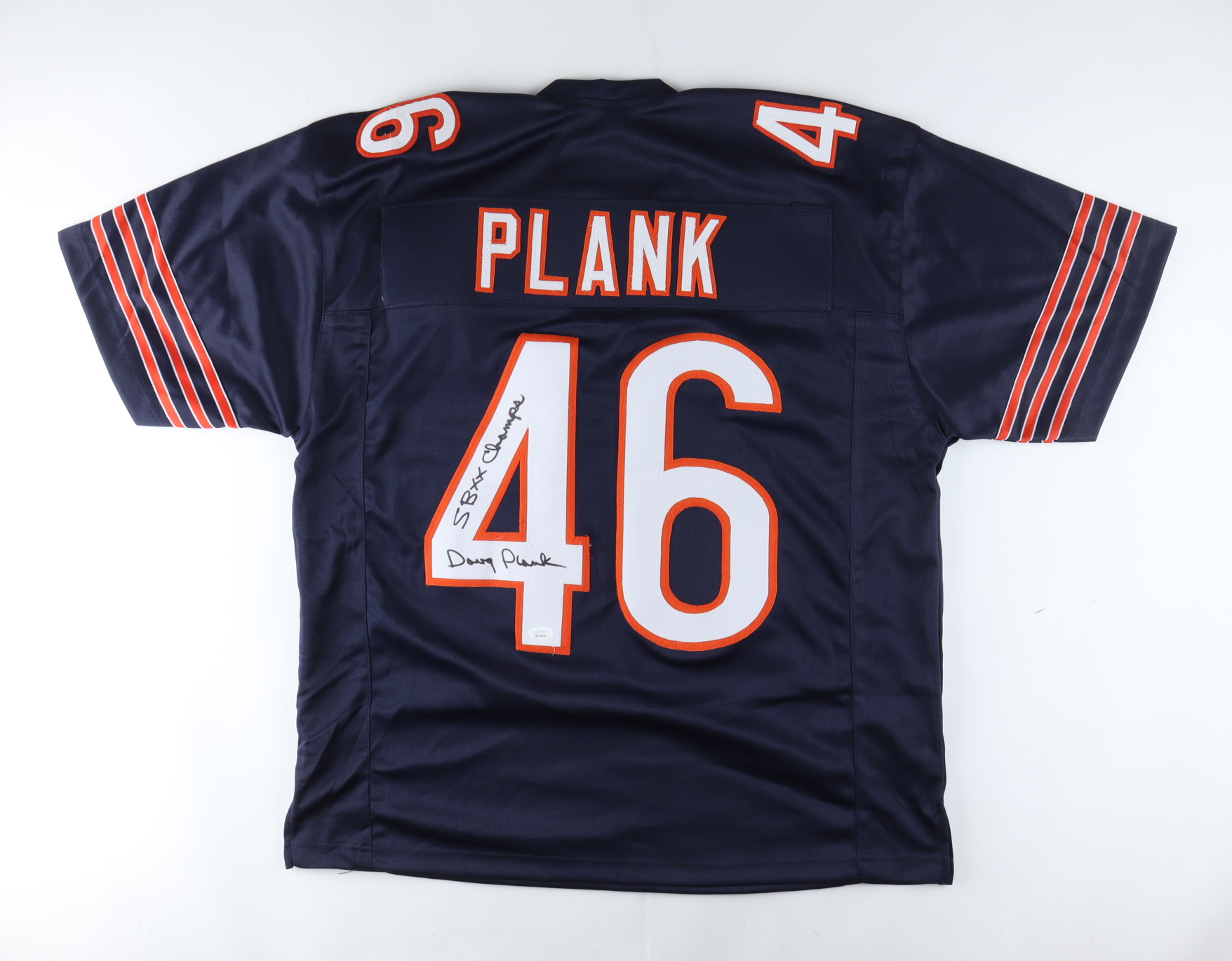 Custom on-field style jersey. Everything is sewn on, size XL. Hand-signed and inscribed by Doug Plank.
