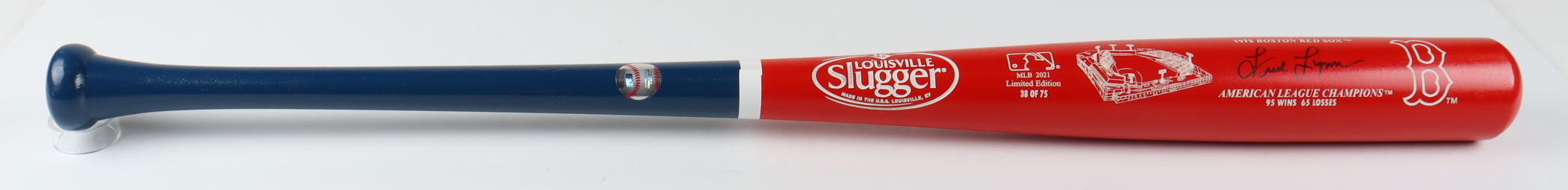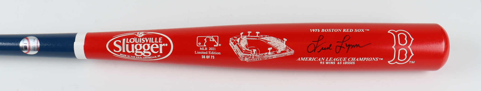 Boston Red Sox American League Champions Limited Edition Louisville Slugger Baseball Bat. Hand-signed by Fred Lynn. The baseball bat is numbered limited edition #38/75.