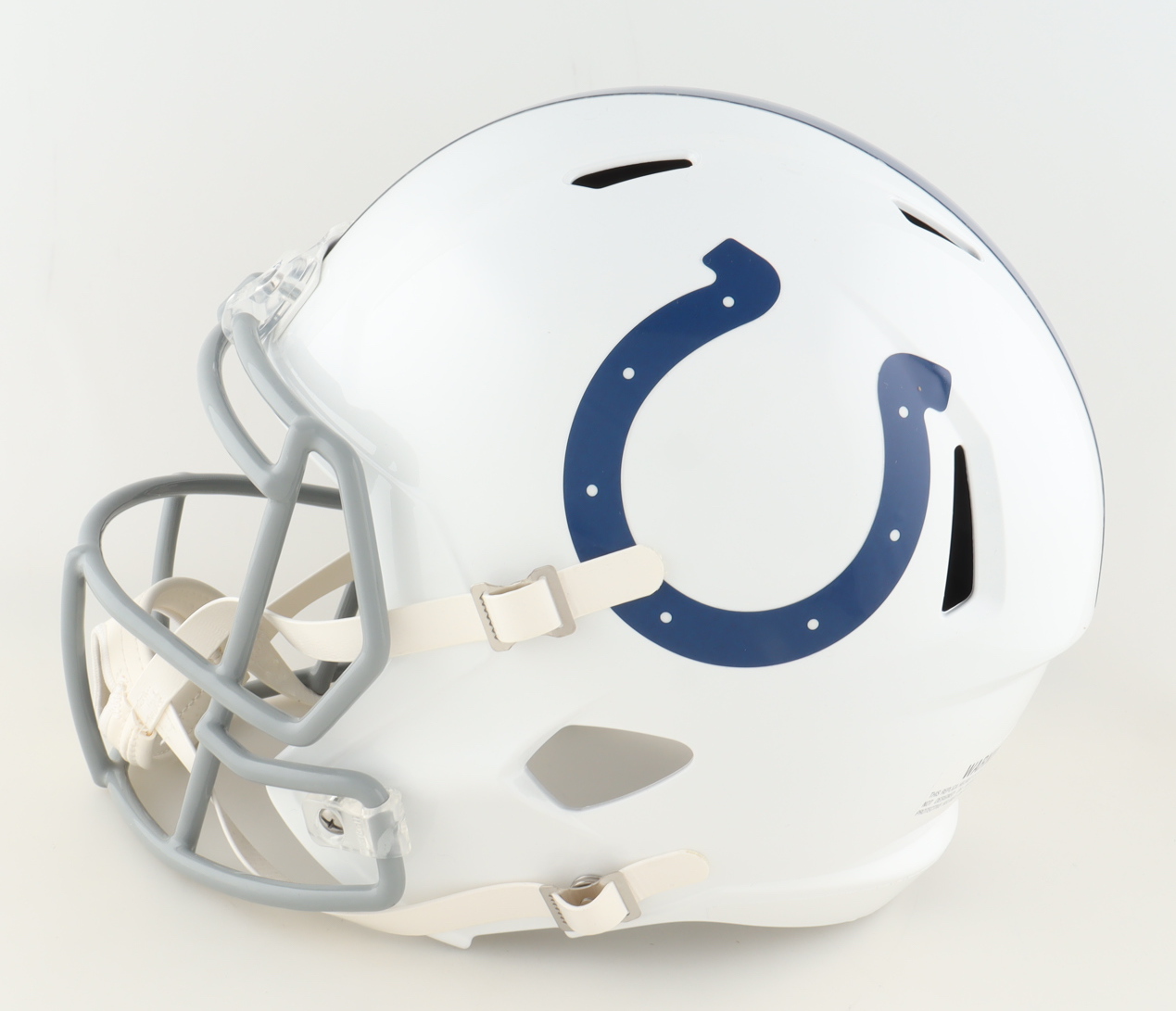 Riddell Indianapolis Colts full-size replica speed helmet. Hand-signed by Marvin Harrison (HOF).