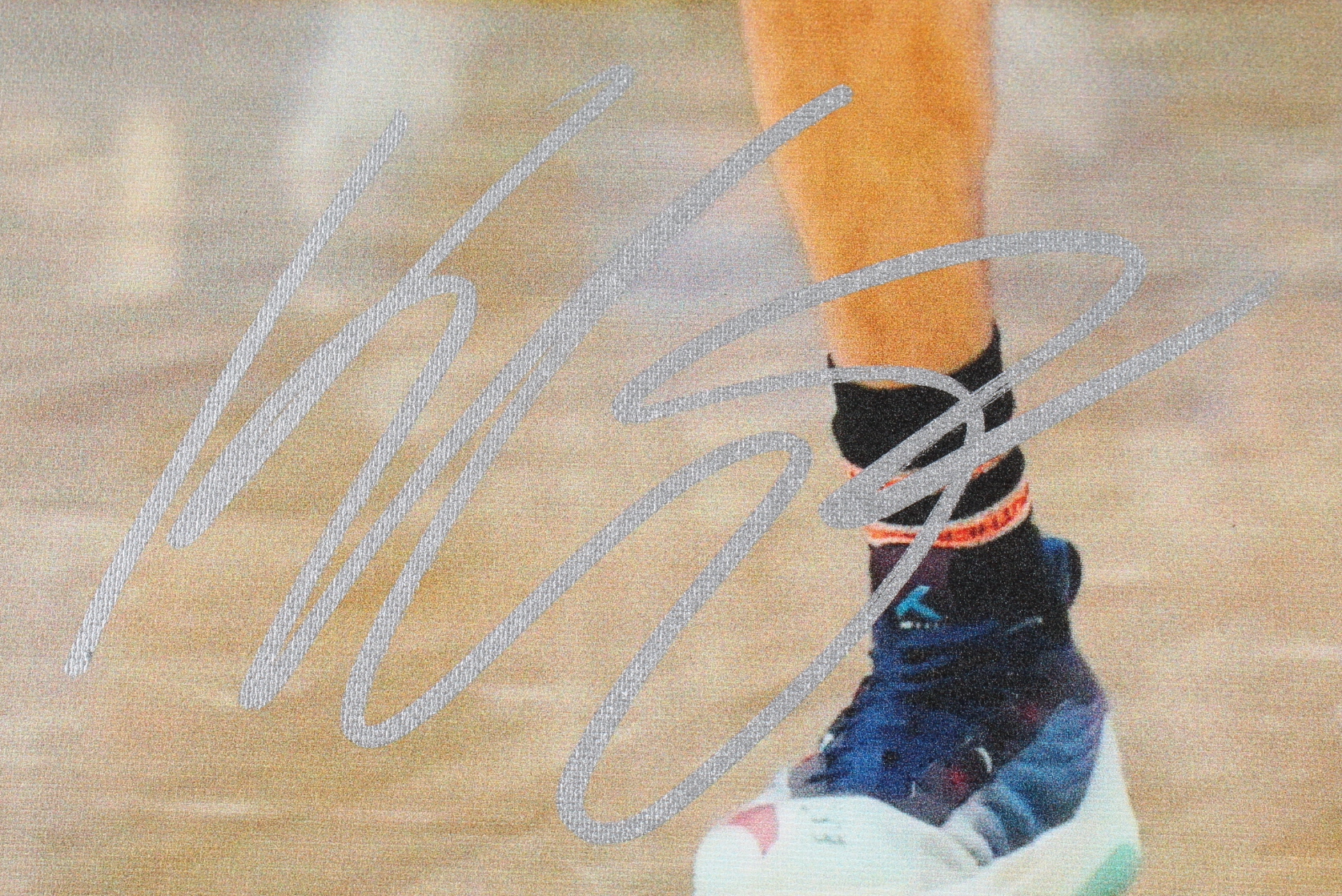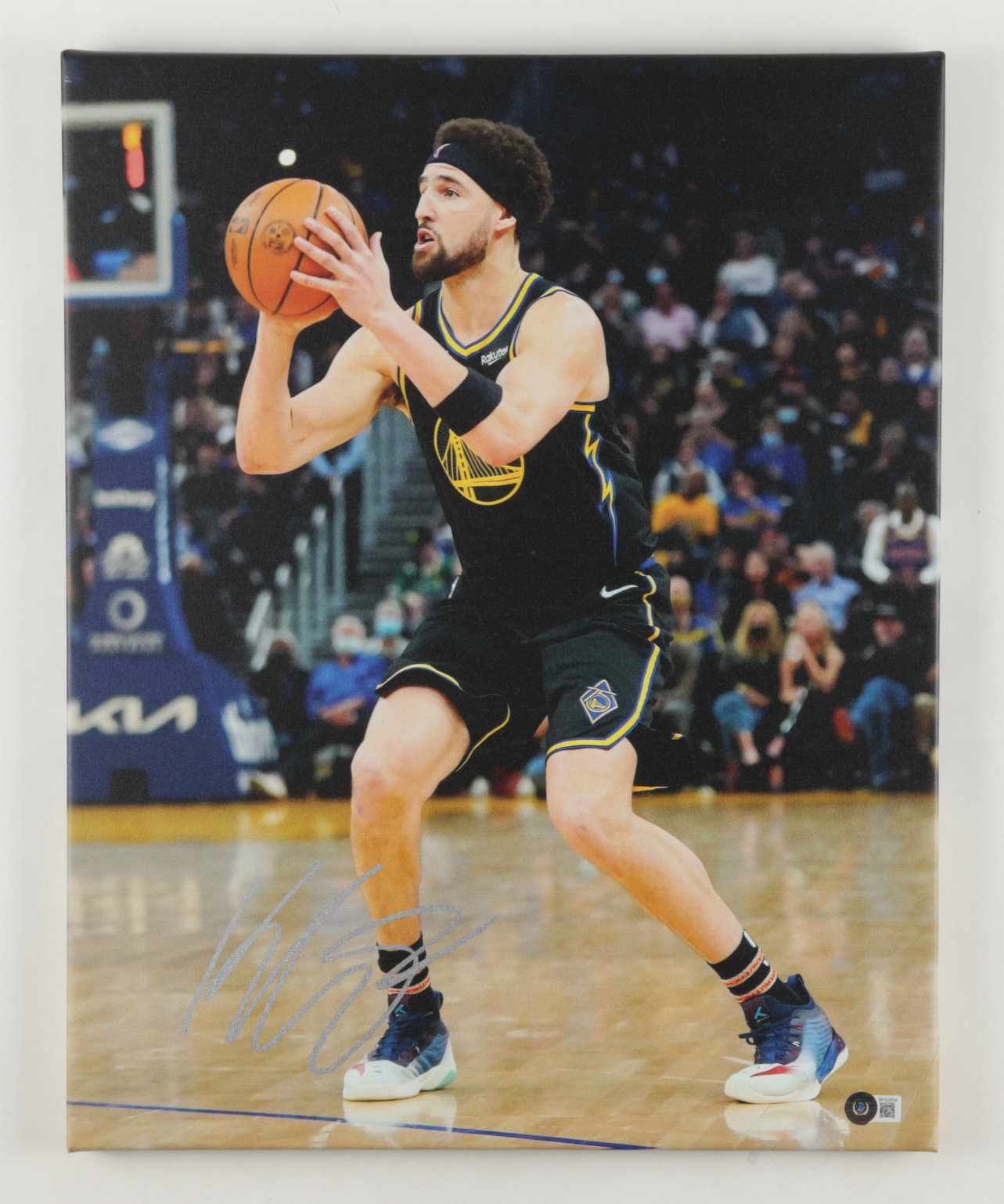Print on canvas measures approximately 16" x 20" in size and has been hand-signed by Klay Thompson (Golden State Warriors).