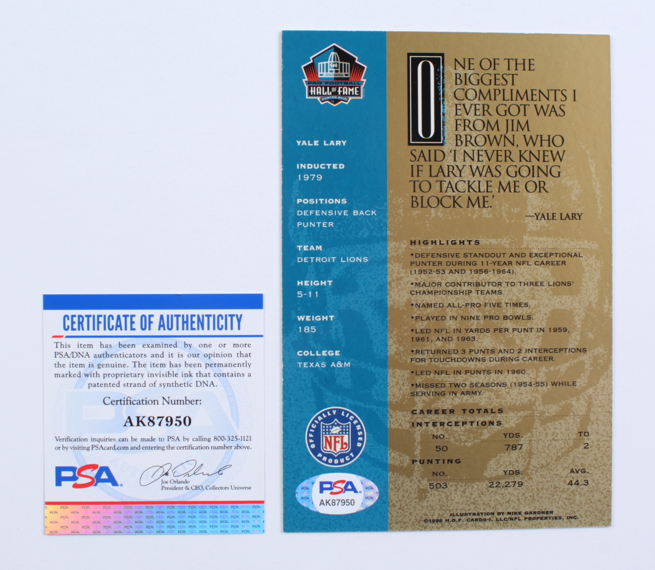 Hall of Fame Signature Series Card measures approximately 4" x 6" in size and has been hand-signed and inscribed by Yale Lary (D. 2017, Detroit Lions, HOF).