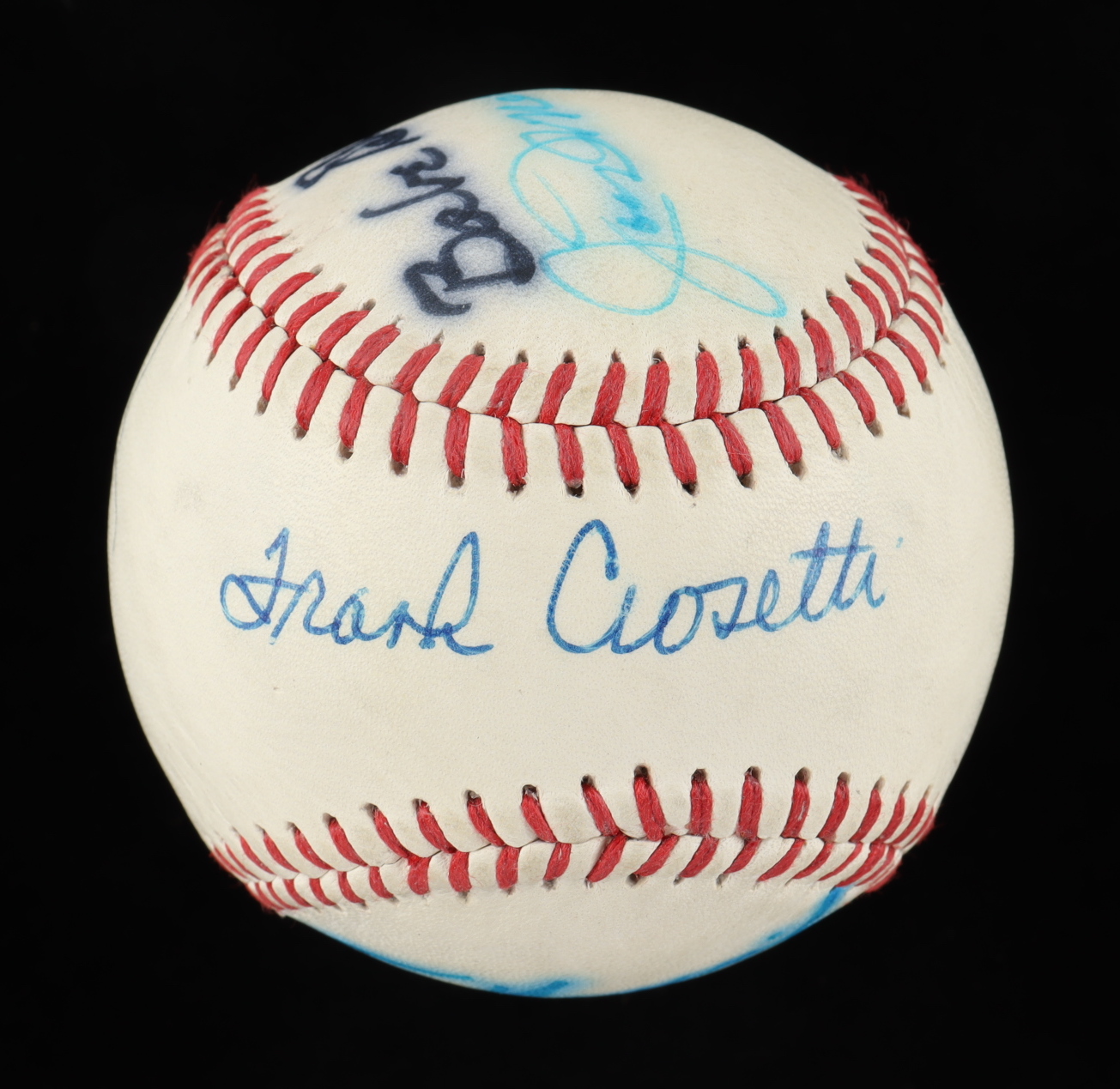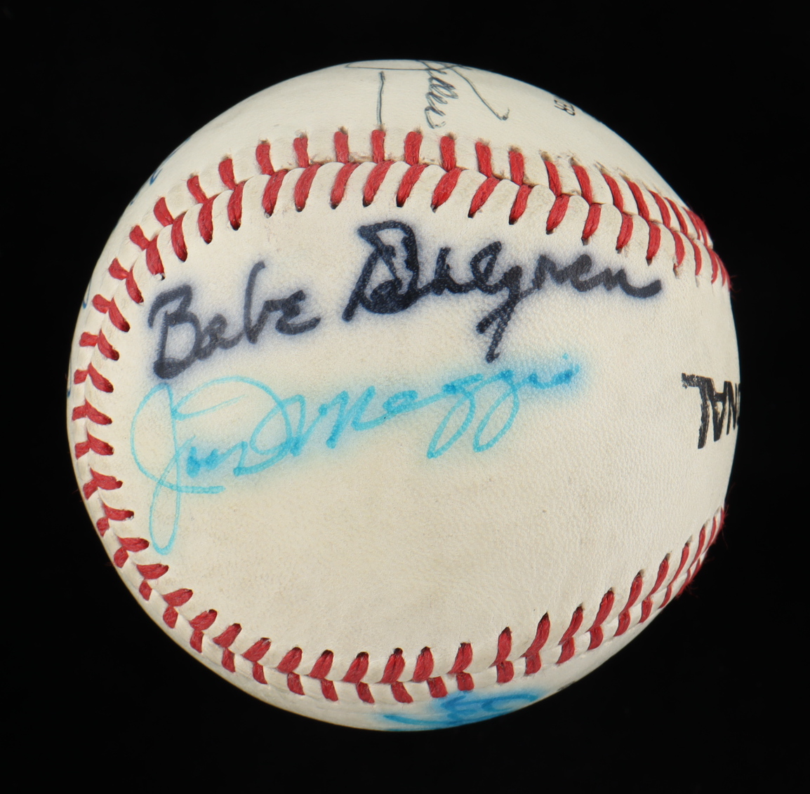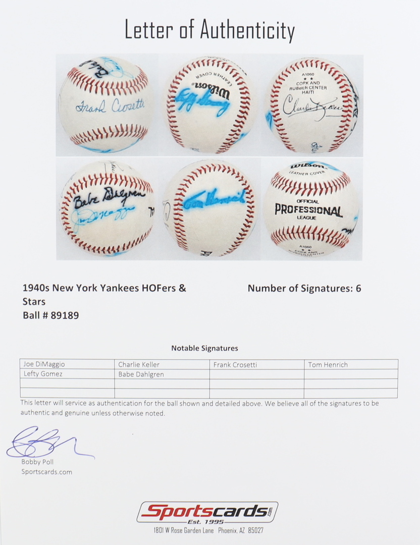 Wilson Official Professional League Baseball. Hand-signed by Joe DiMaggio, Lefty Gomez, Charlie Keller, Frank Crosetti, Tom Henrich and Babe Dahlgren.