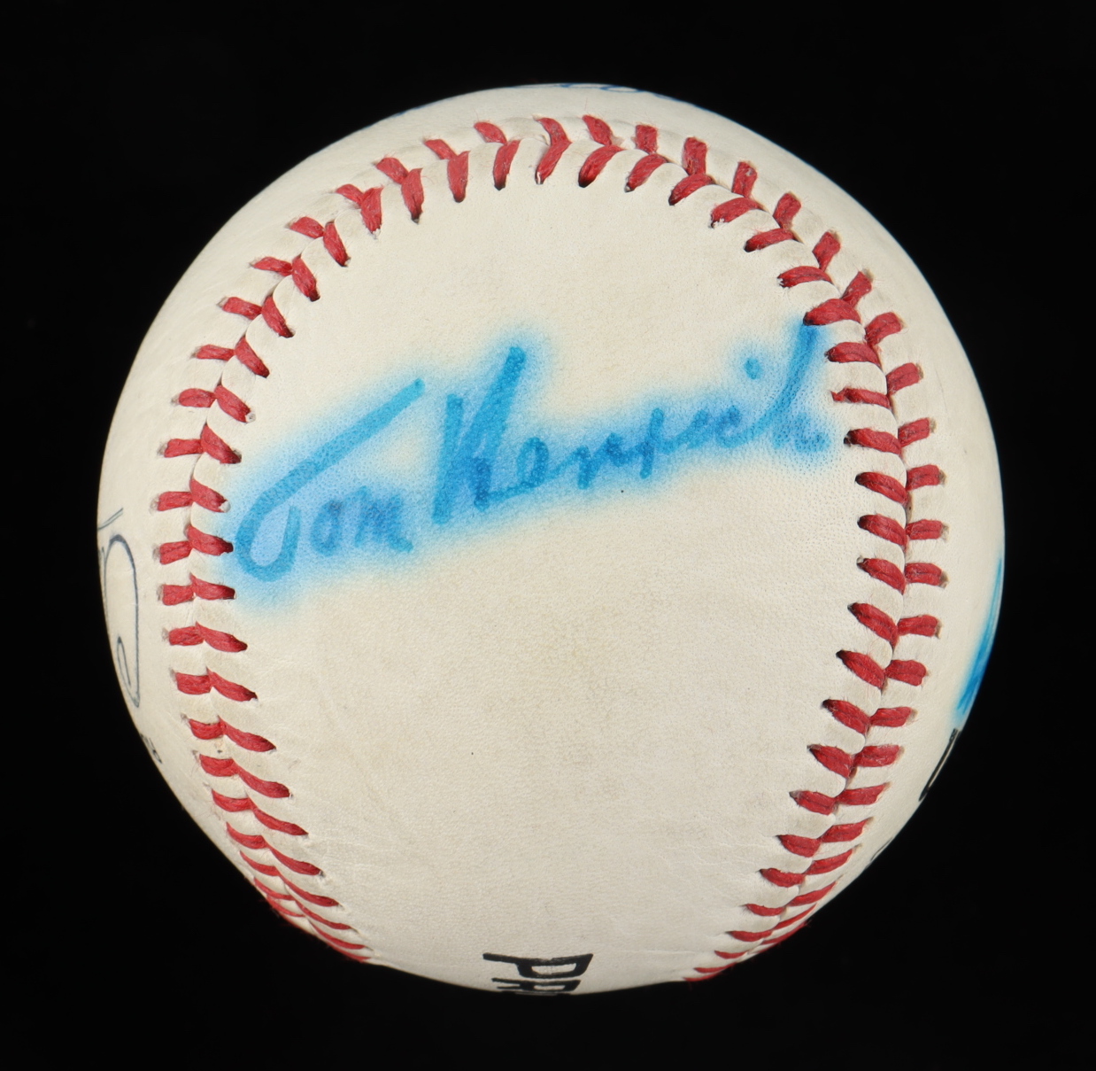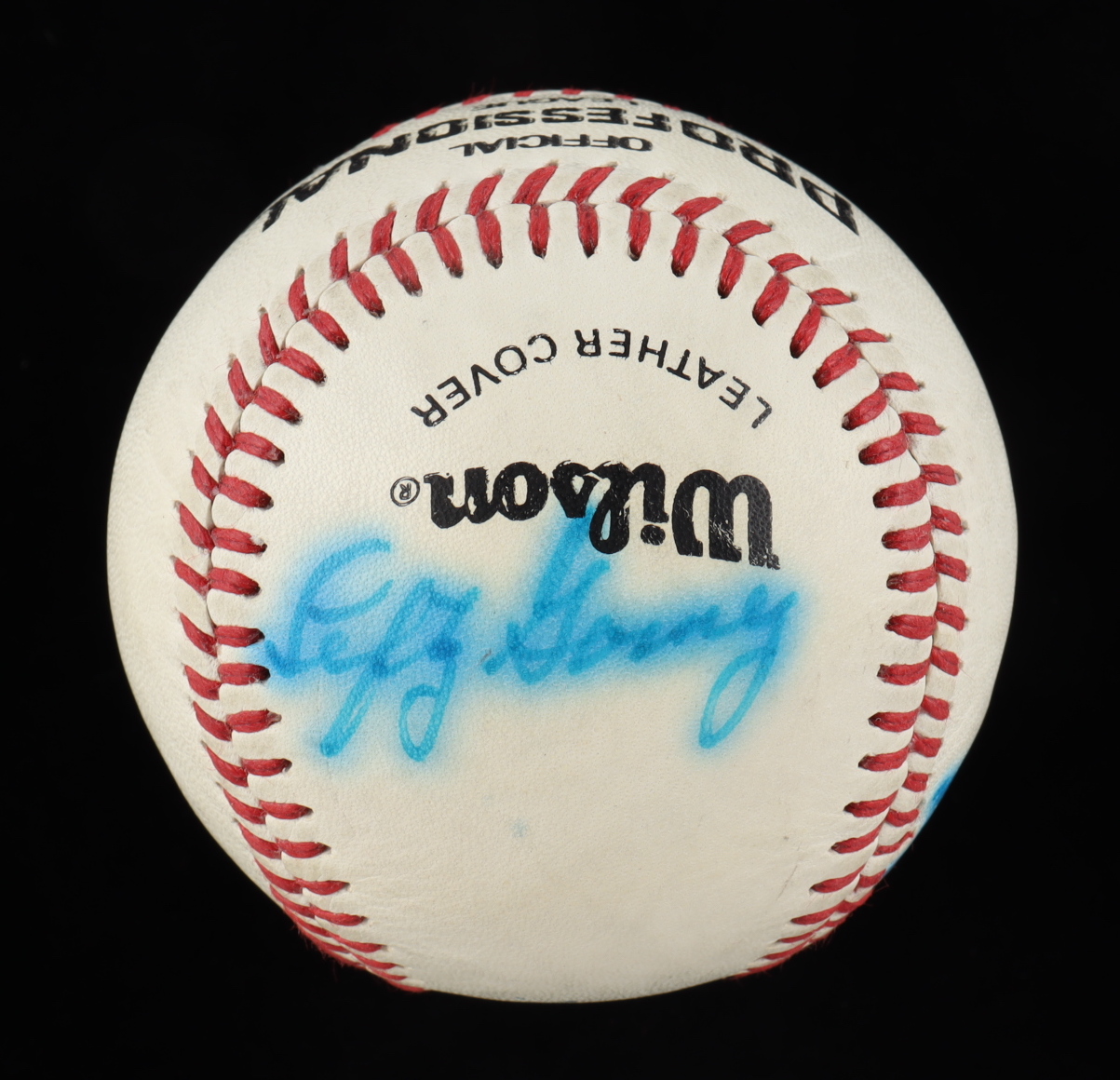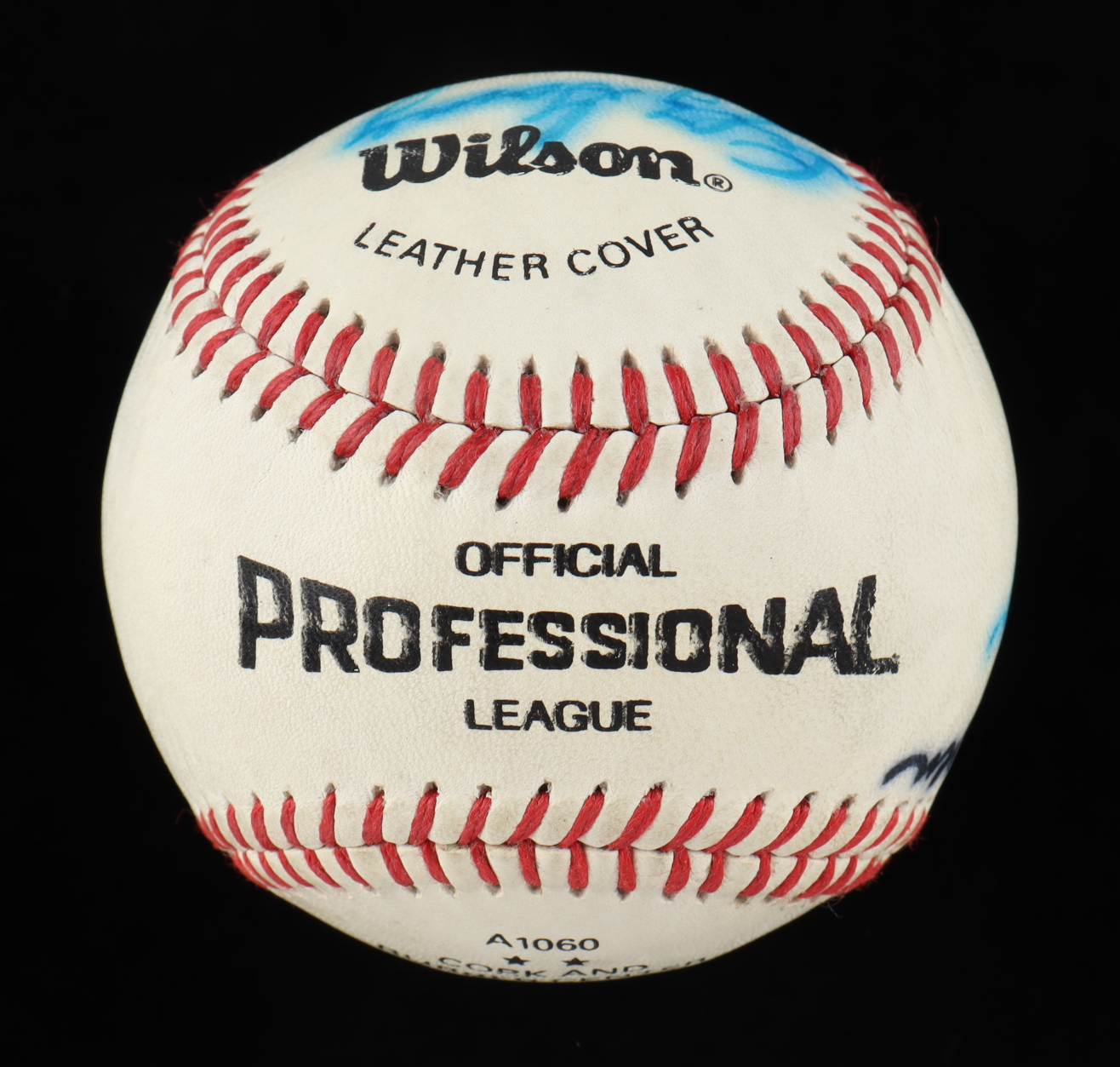 Wilson Official Professional League Baseball. Hand-signed by Joe DiMaggio, Lefty Gomez, Charlie Keller, Frank Crosetti, Tom Henrich and Babe Dahlgren.