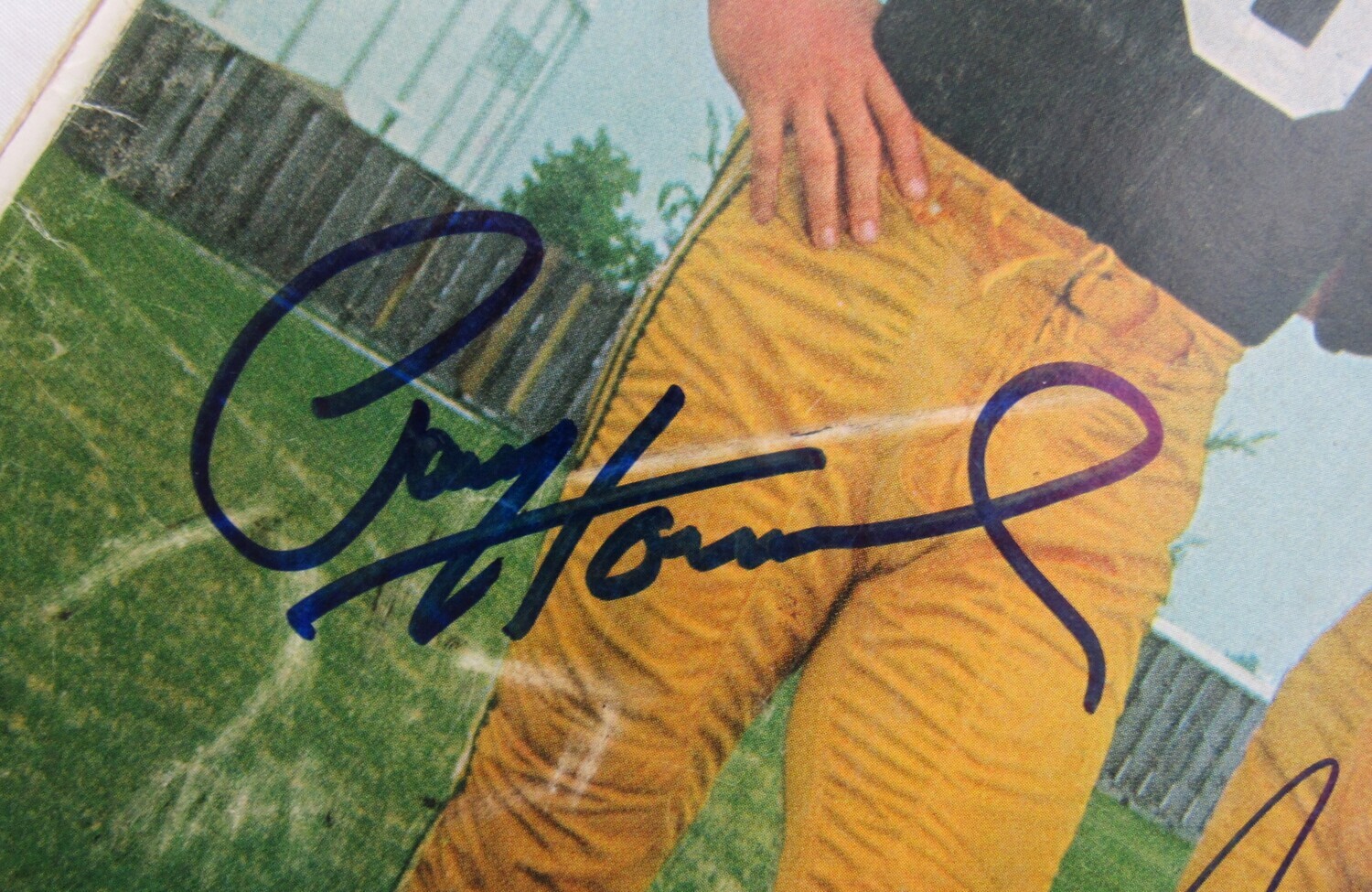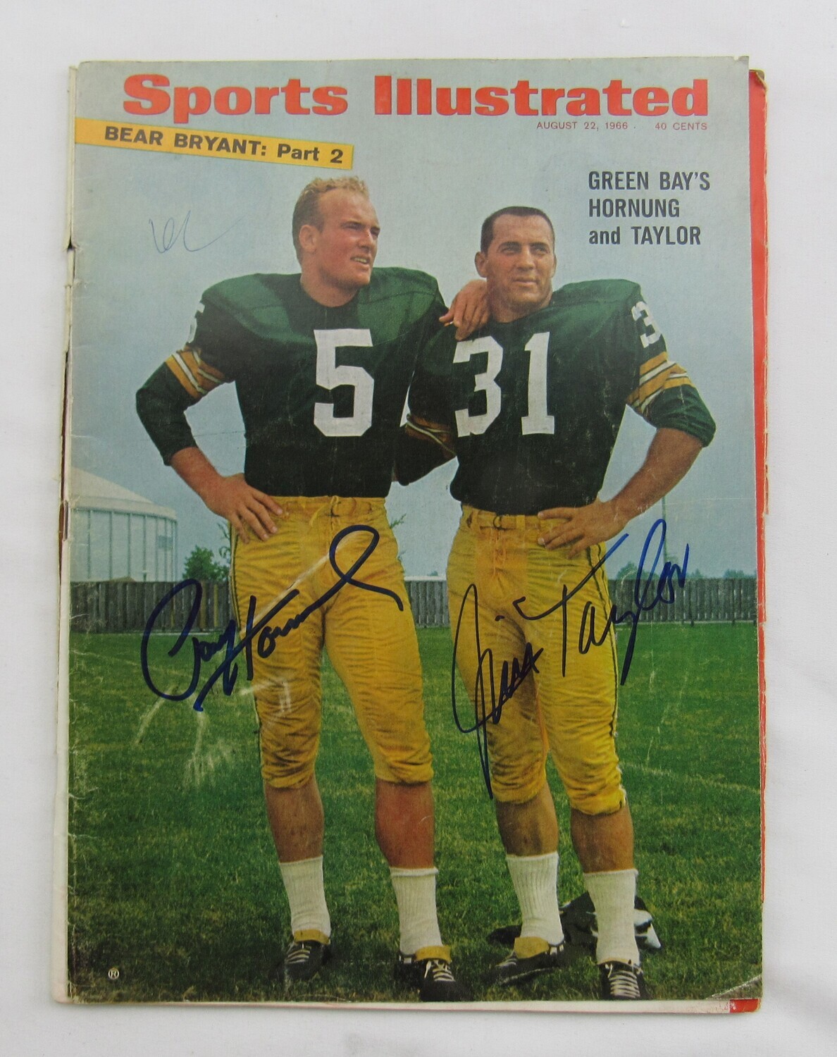 August 22nd, 1966 "Sports Illustrated" magazine has been hand-signed on the cover by Paul Hornung (D.2020, Green Bay Packers, HOF) and Jim Taylor (D.2018, Green Bay Packers, HOF). Please note, the front and back covers are separated up to the mid point of the magazine's spine and the magazine shows wear.