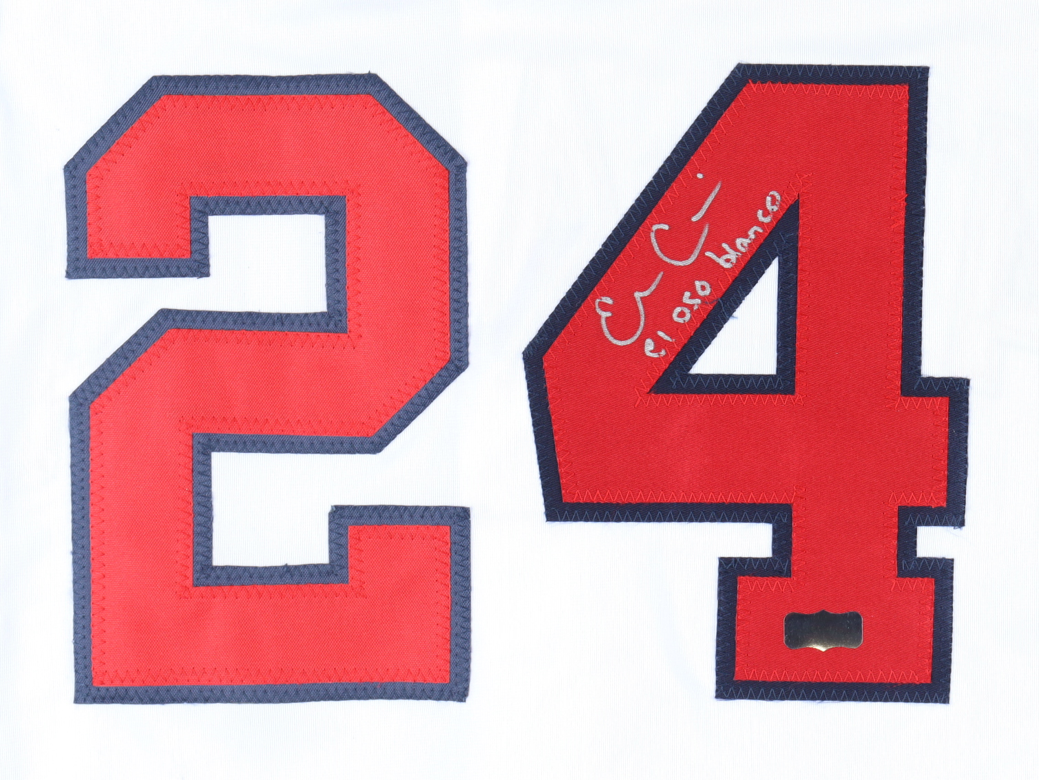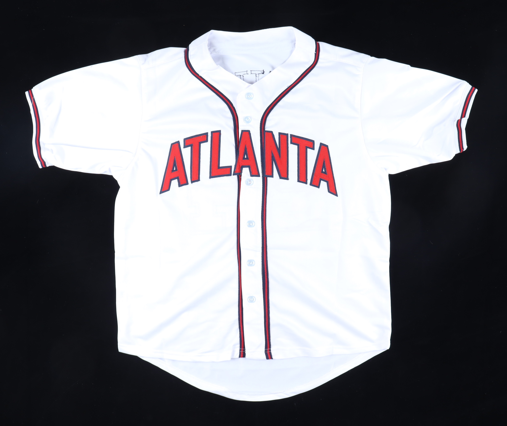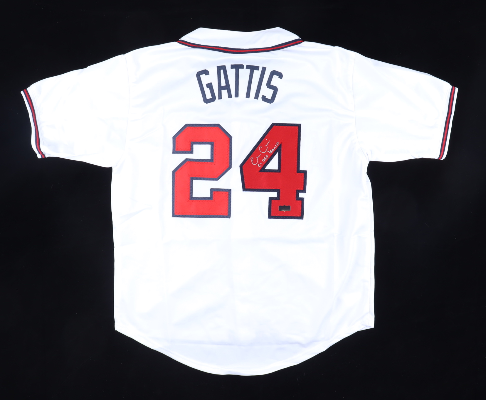 Custom on-field style jersey. Everything is sewn on, size XL. Hand-signed and inscribed by Evan Gattis. Please note, stain on front of jersey.