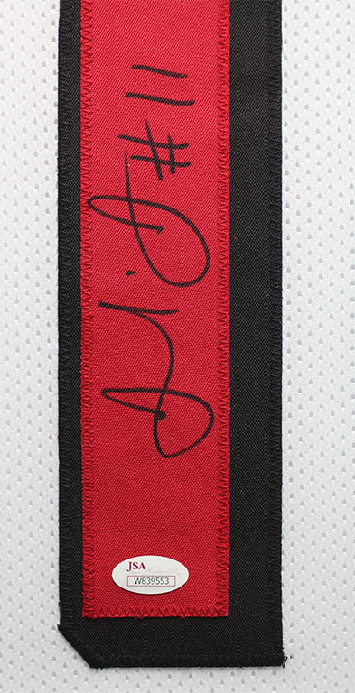 A beautifully framed autographed Julio Jones Falcons Jersey. The autograph is certified by JSA and includes a sticker on the Jersey and a matching certificate attached to the back of the frame.