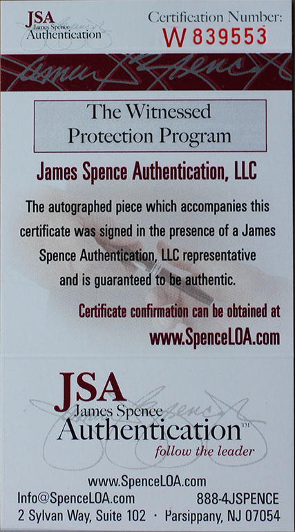 The autograph includes an official James Spence Authentication (JSA) hologram and matching COA for authenticity purposes. The signing of this item was witnessed by JSA.
