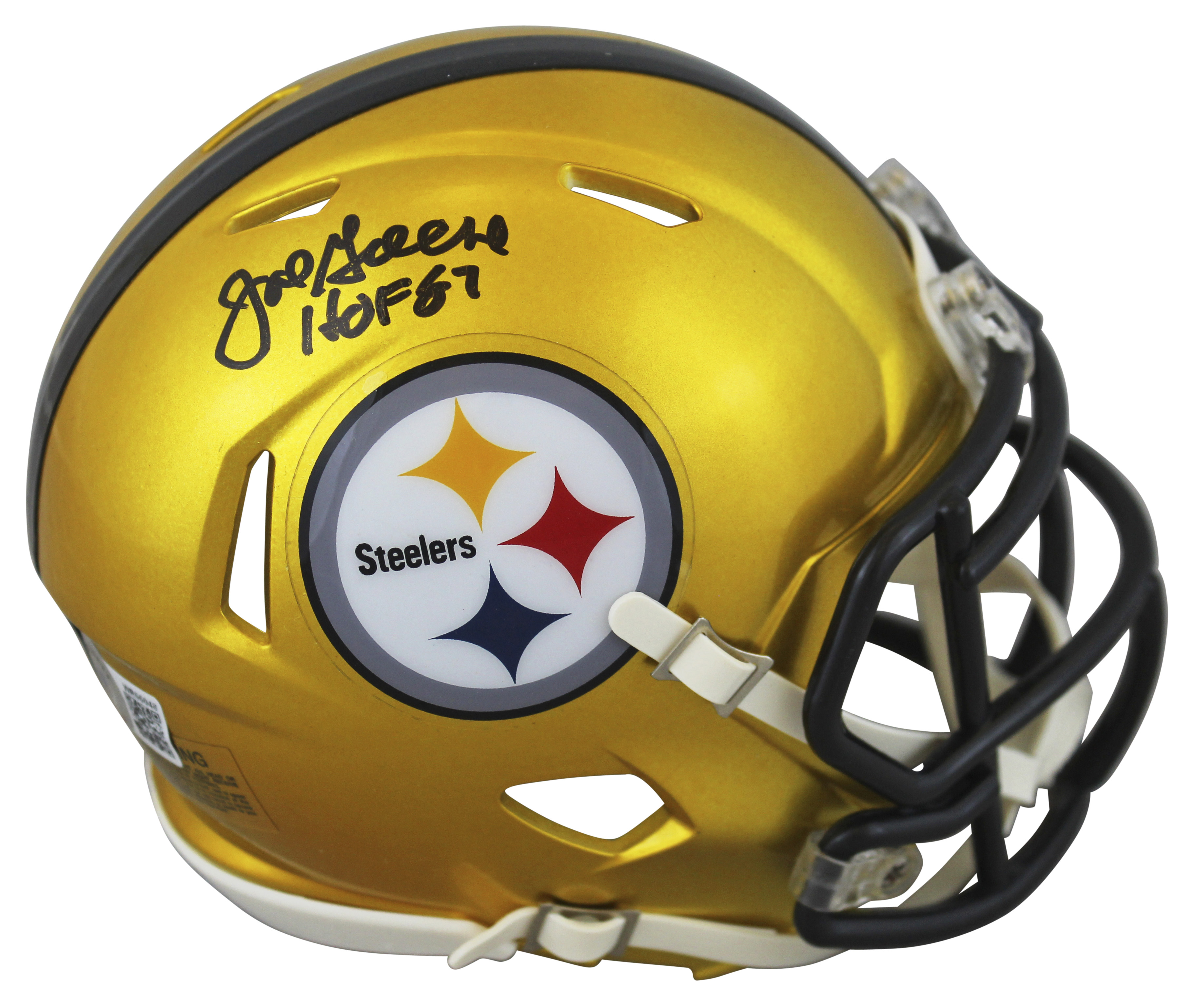 Riddell Pittsburgh Steelers flash alternative speed mini helmet. Hand-signed and inscribed by Joe Greene (HOF).