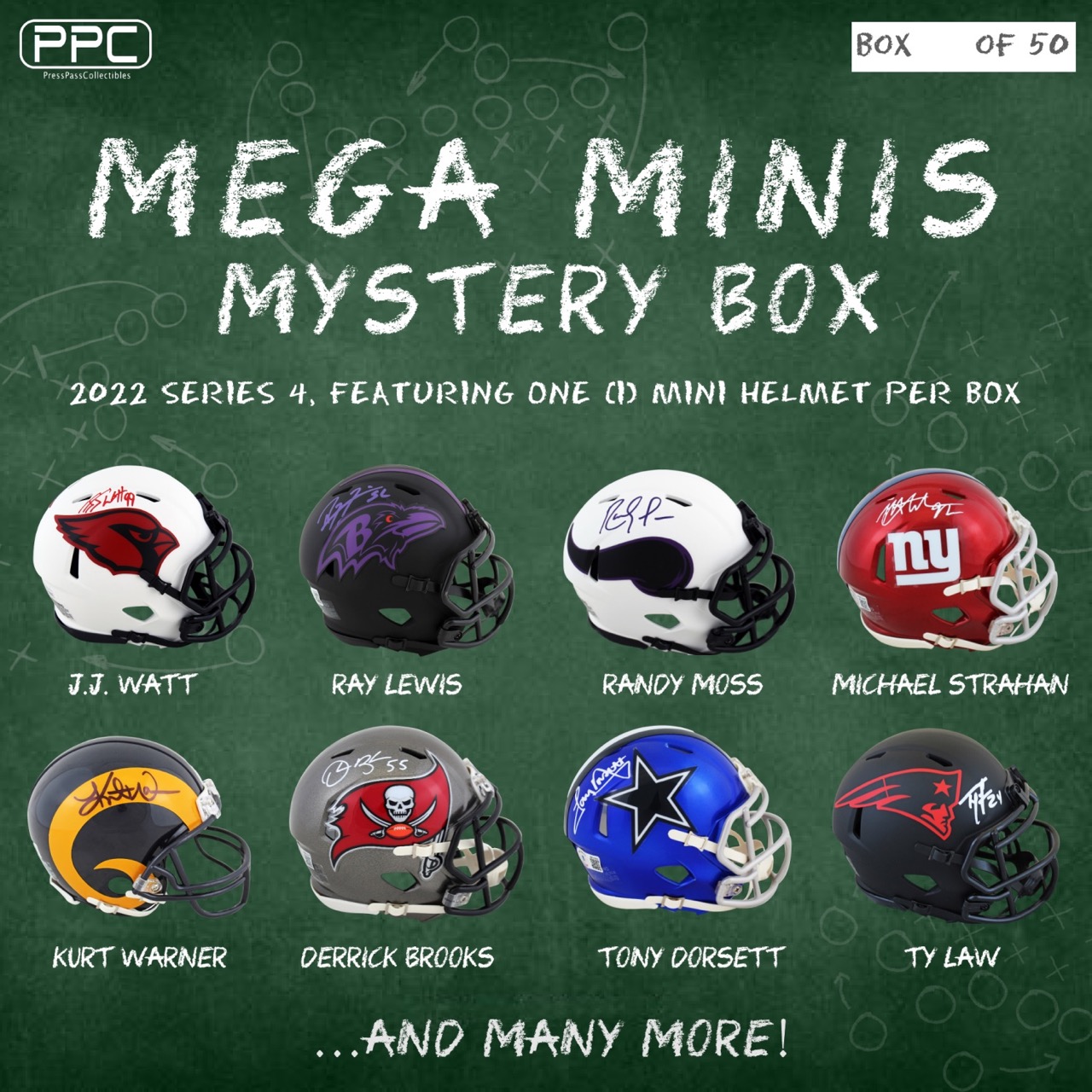 The Press Pass Collectibles 2022 mini helmet mystery box includes one (1) mini helmet from your favorite NFL teams. Boxes will feature mini helmets signed by Michael Strahan, Kurt Warner, Derrick Brooks, Ty Law, and many more!