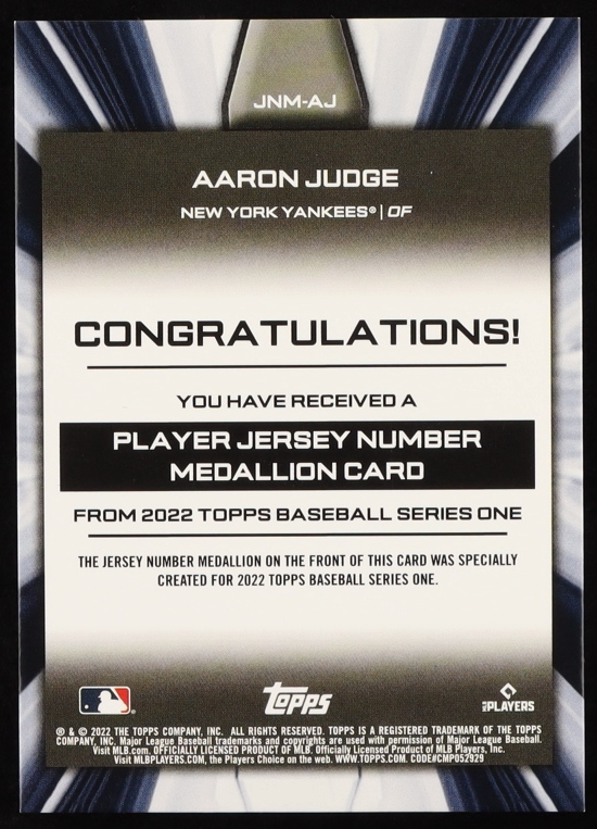Aaron Judge 2022 Topps Commemorative Player Jersey Number Medallions #JNMAJ
