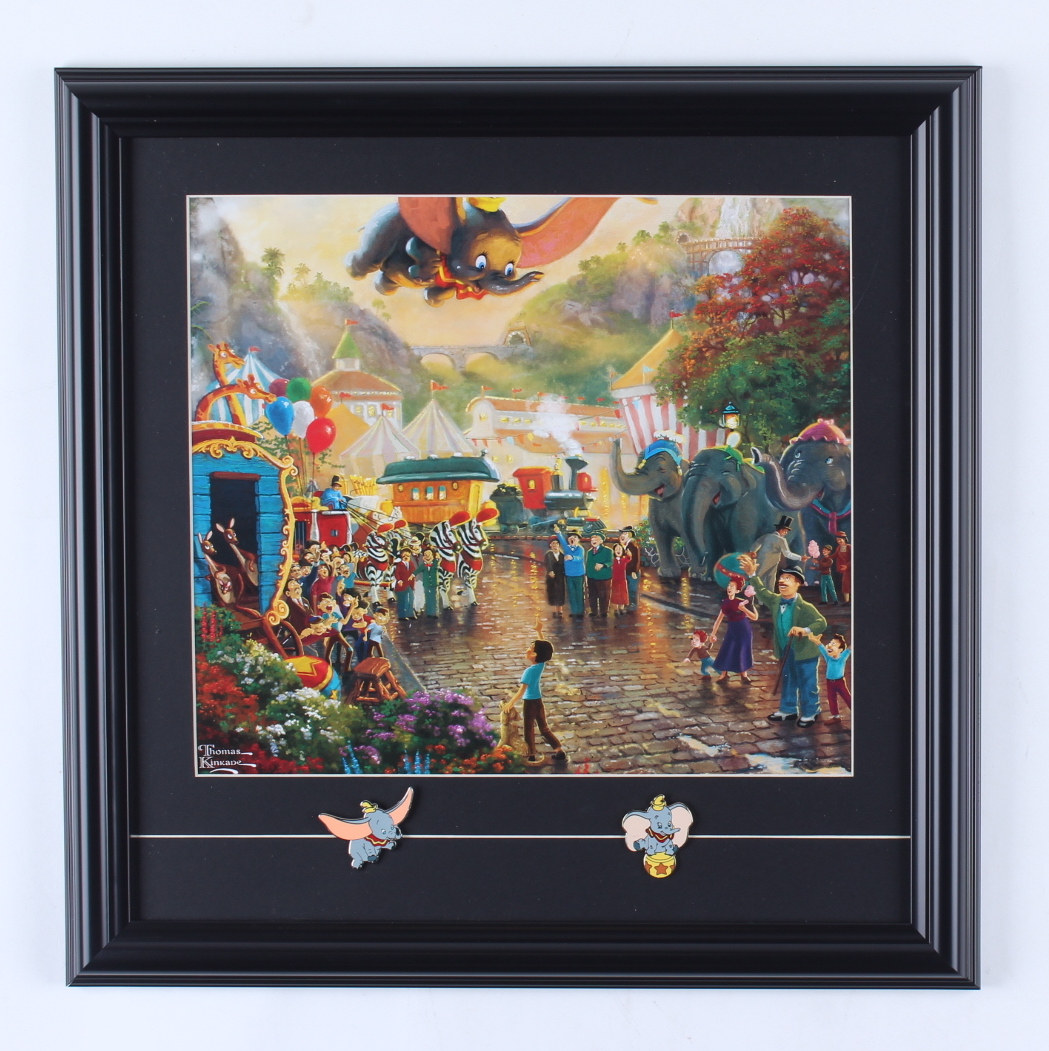 Custom frame measures 16" x 16" in size and features a print of "Dumbo" by Thomas Kinkade (D. 2012). Dispaly also features (2) Dumbo Disney pins.