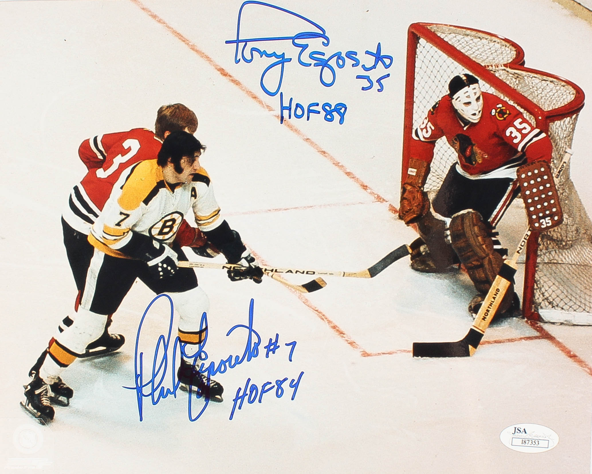 Photo measures 8" x 10" and has been hand-signed in blue felt-tip pen by Phil Esposito (Bruins, HOF) and Tony Esposito (Blackhawks, HOF).
