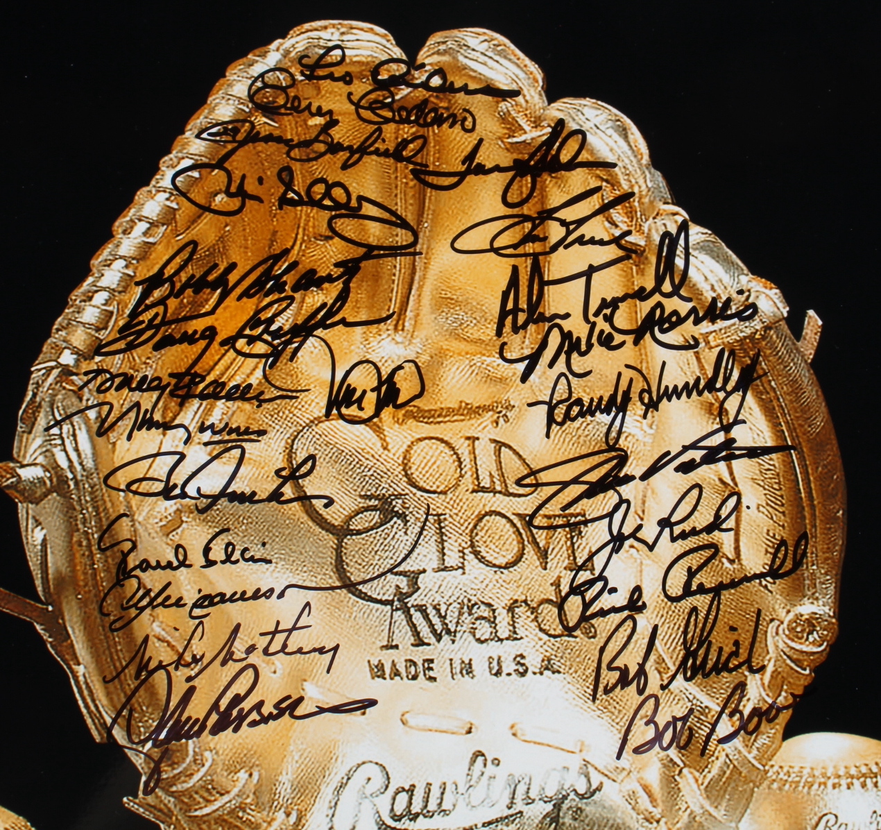 Photo measures 16" x 20" and has been hand signed by (23) Golden Glove Award winners including Andre Dawson, Paul Blair, Bobby Shantz, Bob Boone, Jim Sundberg, Bill Freehan, Cesar Cedeno, Doug Rader, Bobby Grich, Alan Trammell, Mike Matheny, Lance Parrish, Joe Rudi, Mike Norris, Maury Wills, Jesse Barfield, Tommy Helms, Tom Tresh, Leo Cardenas, Doug Griffin, Randy Hundley, Jose Lind, and Rick Reuschel.