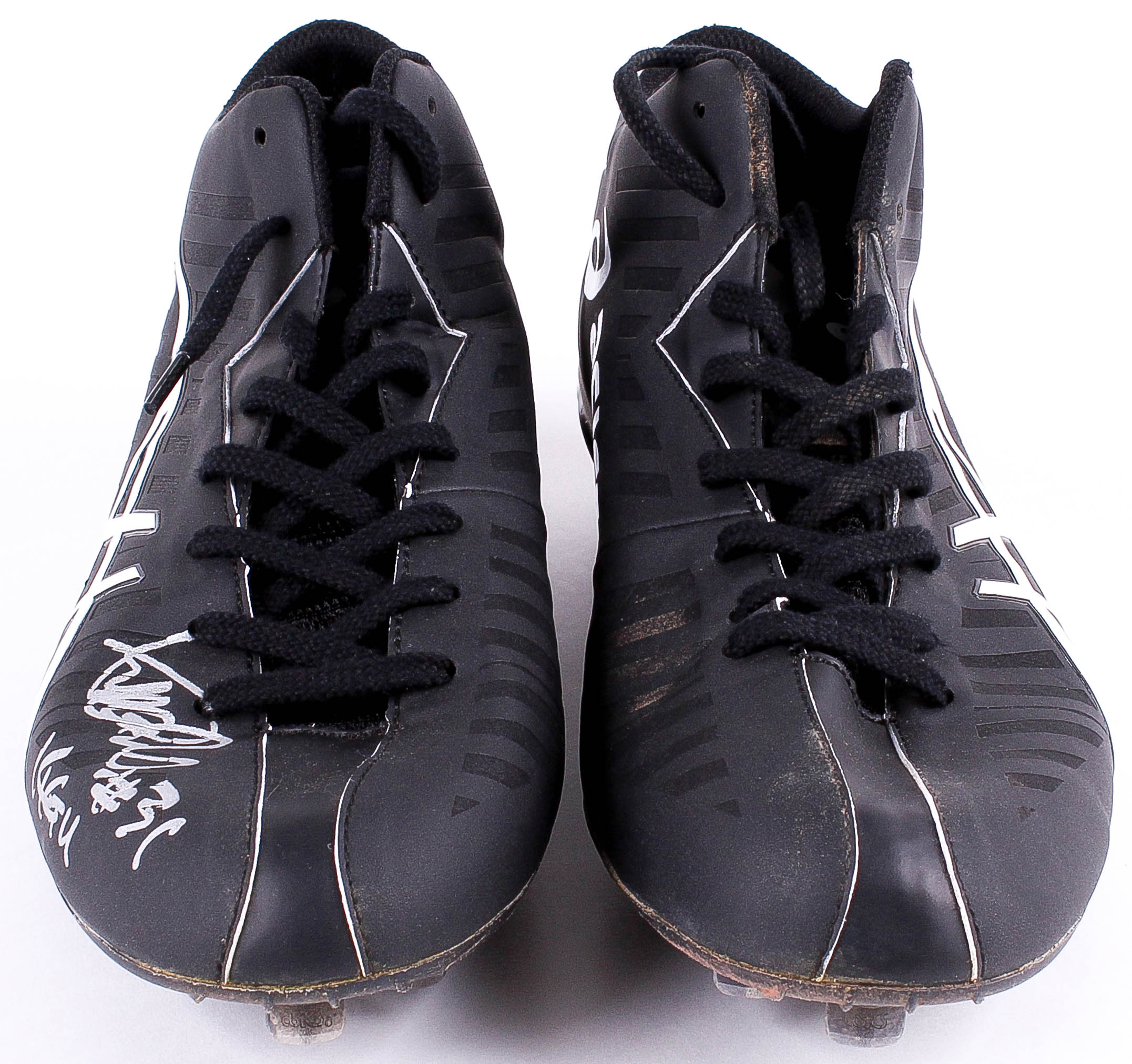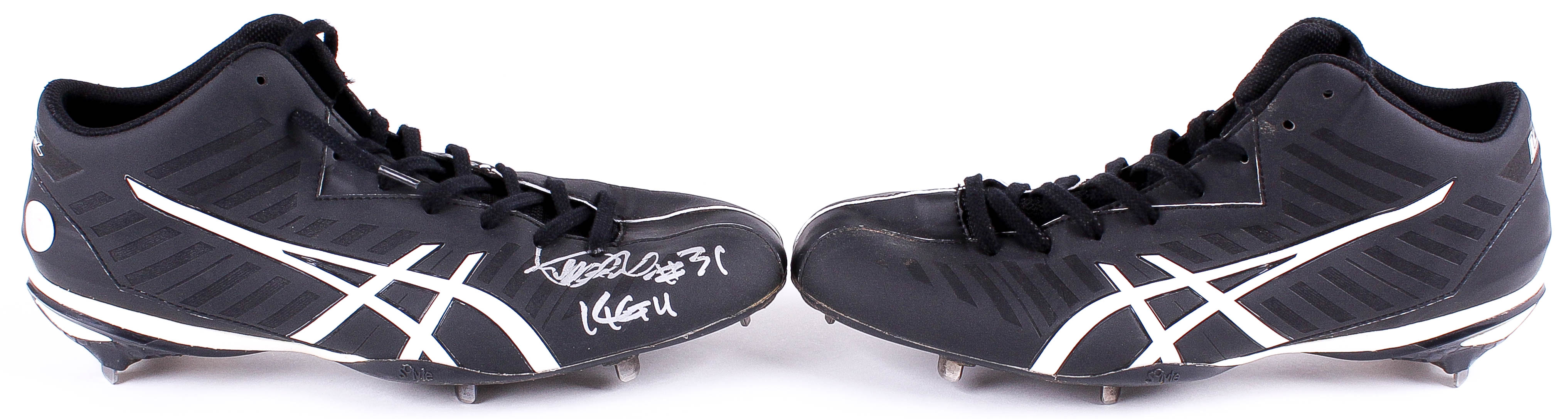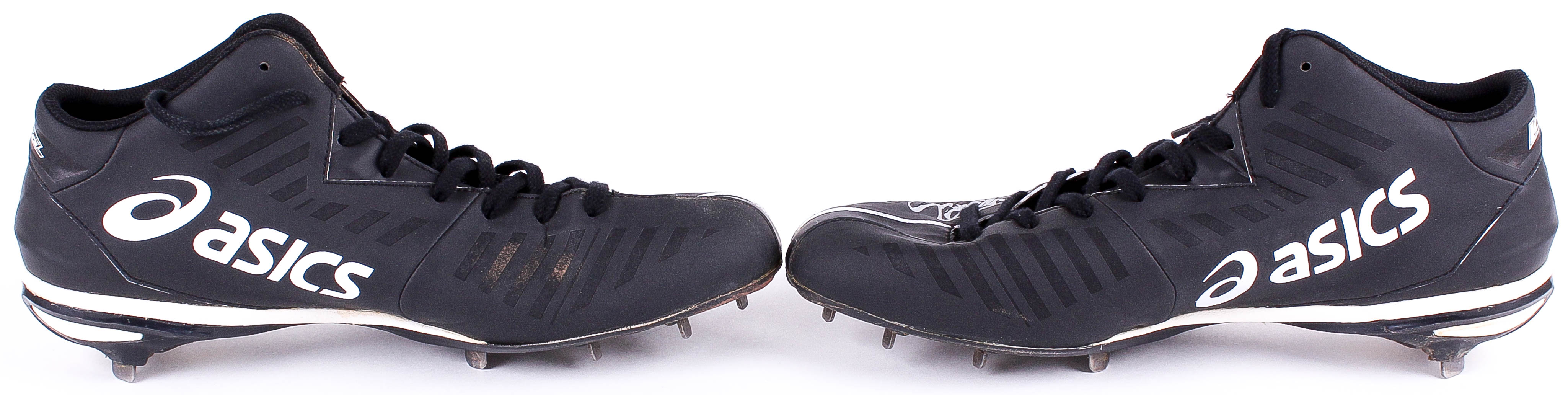 This pair of custom "Ichiro" Asics baseball shoes / cleats were game used by Ichiro Suzuki during his 2014 season with the New York Yankees. Hand-signed and inscribed "14 GU" in silver paint pen by Ichiro. The cleats show heavy use.