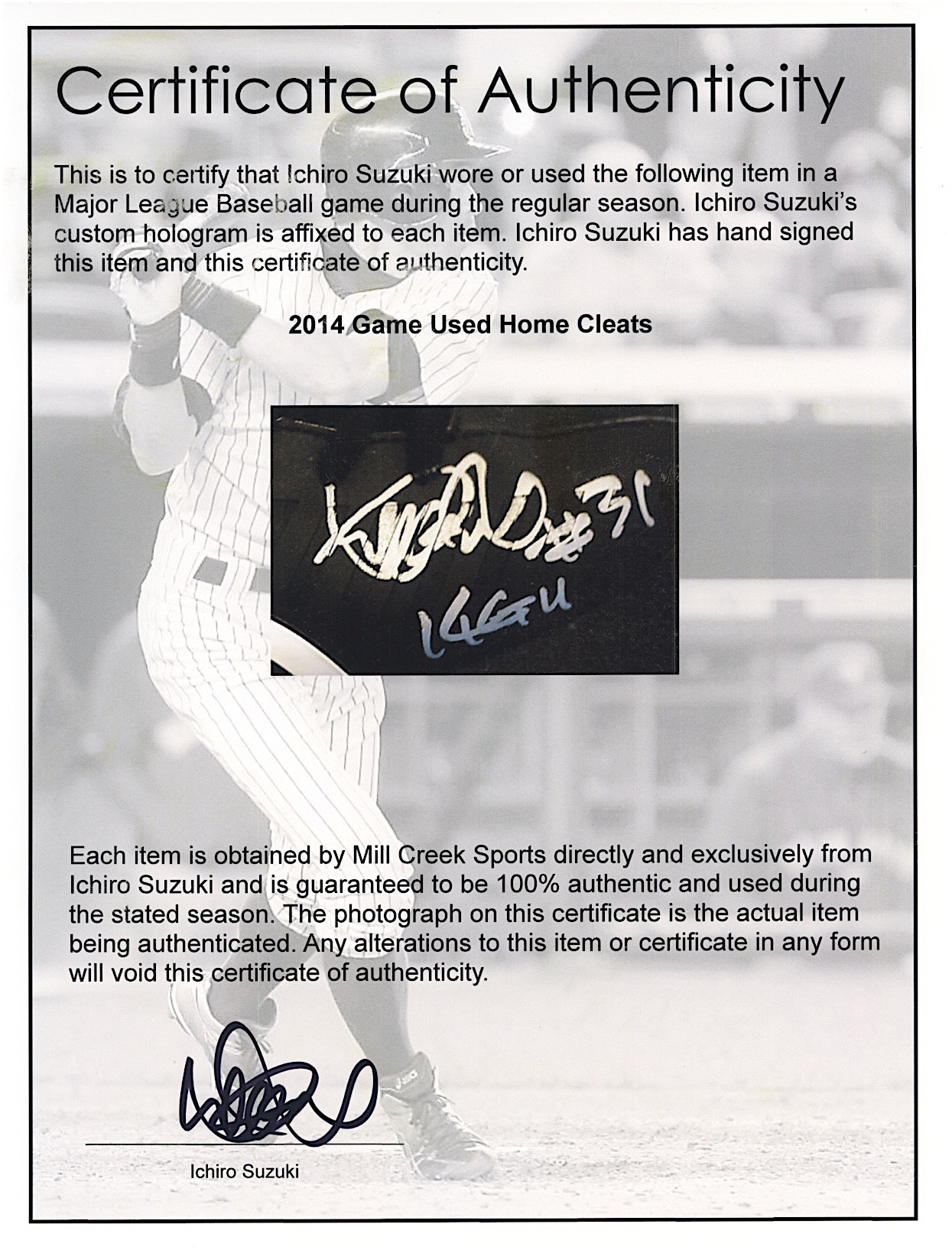 The cleats include an official Letter of Authenticity from Ichiro Suzuki. The LOA is hand-signed by Ichiro.