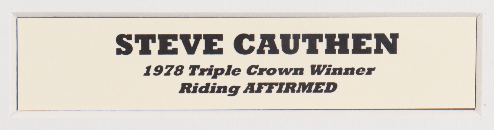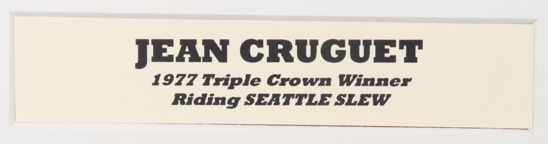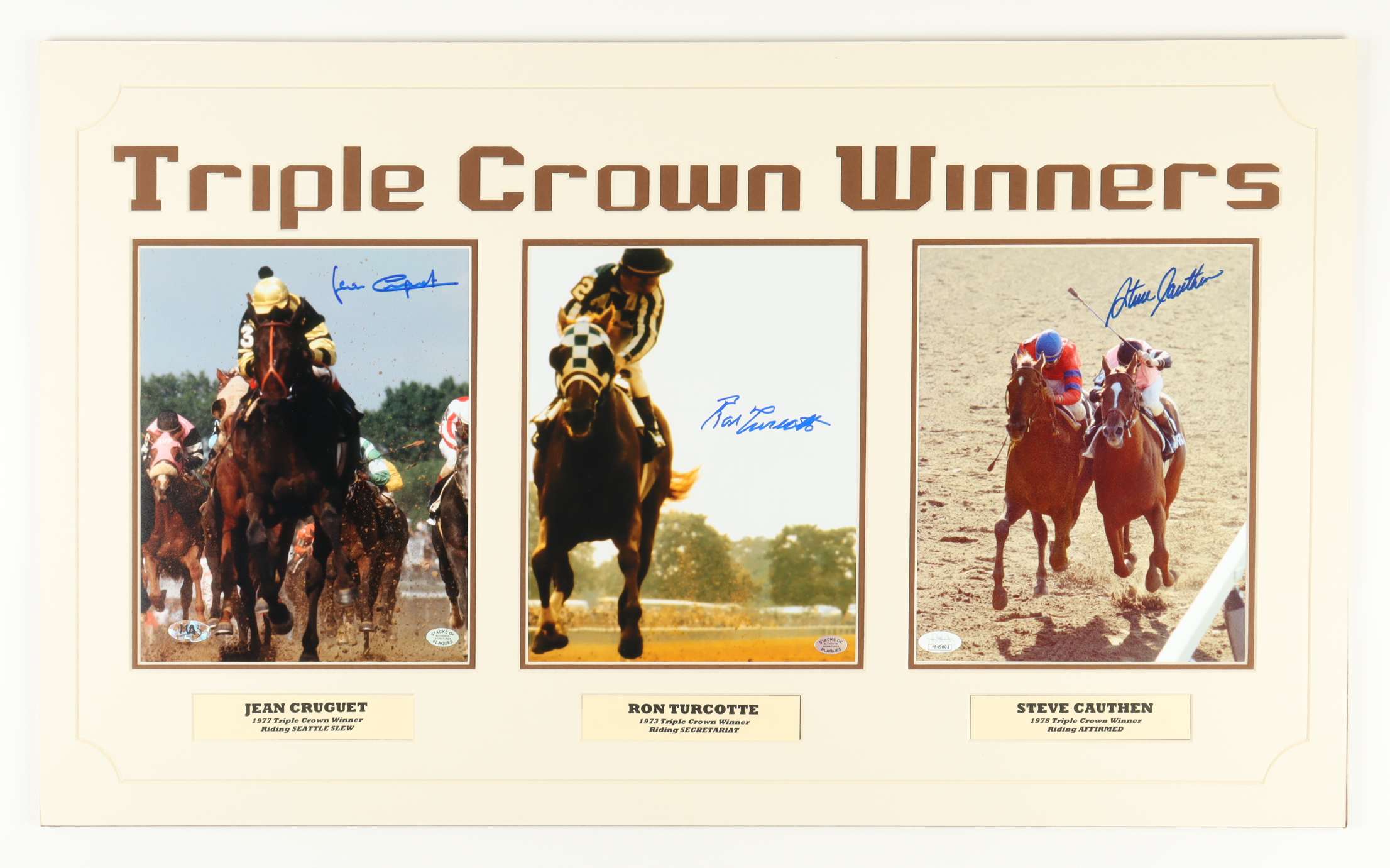 Custom matted display measures approximately 18" x 30" in size and features (3) 8" x 10" photos that have been hand-signed by Jean Cruguet, Ron Turcotte, and Steve Cauthen.