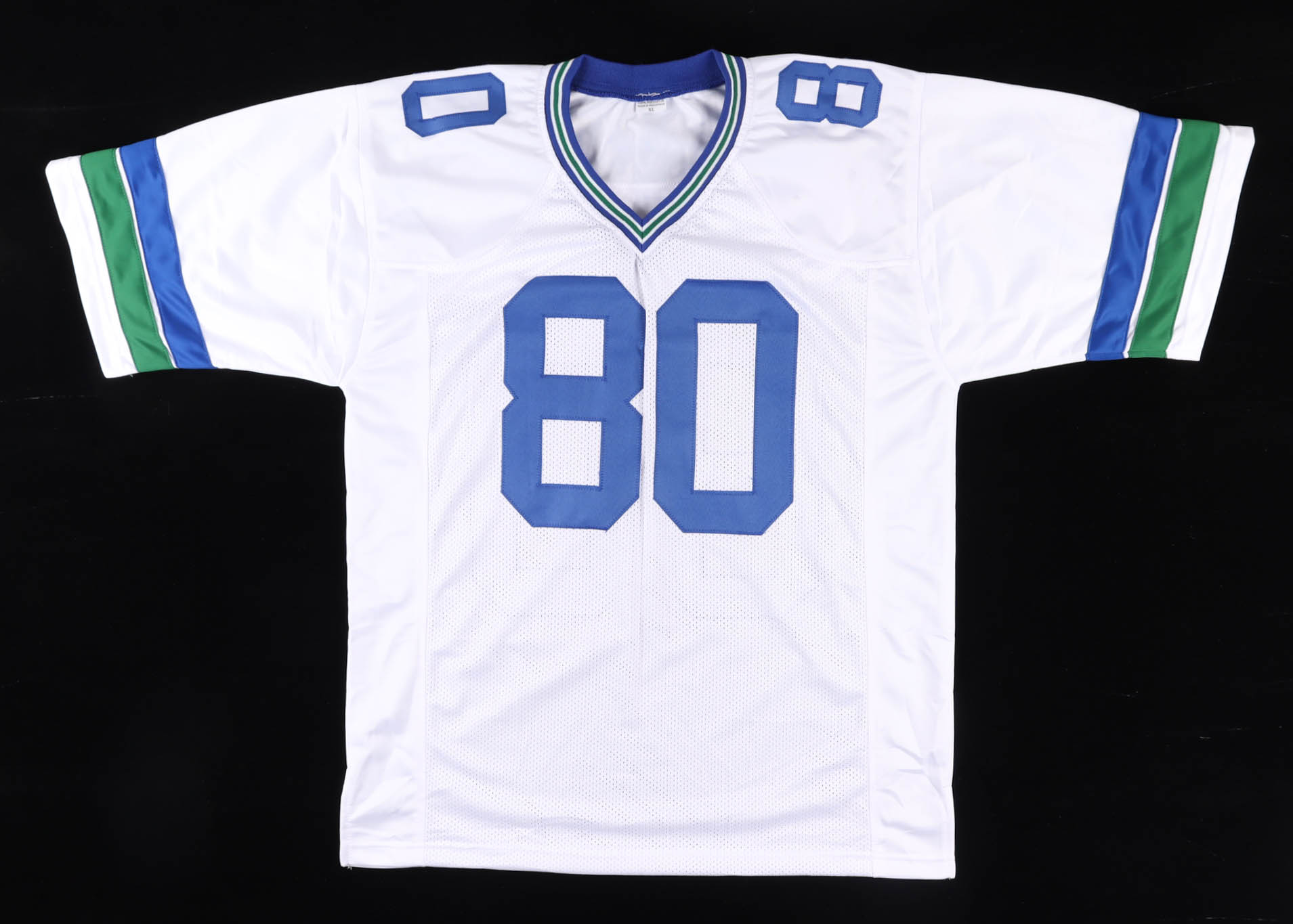 Custom on-field style jersey. Everything sewn on, size XL. Hand-signed by Steve Largent (HOF).