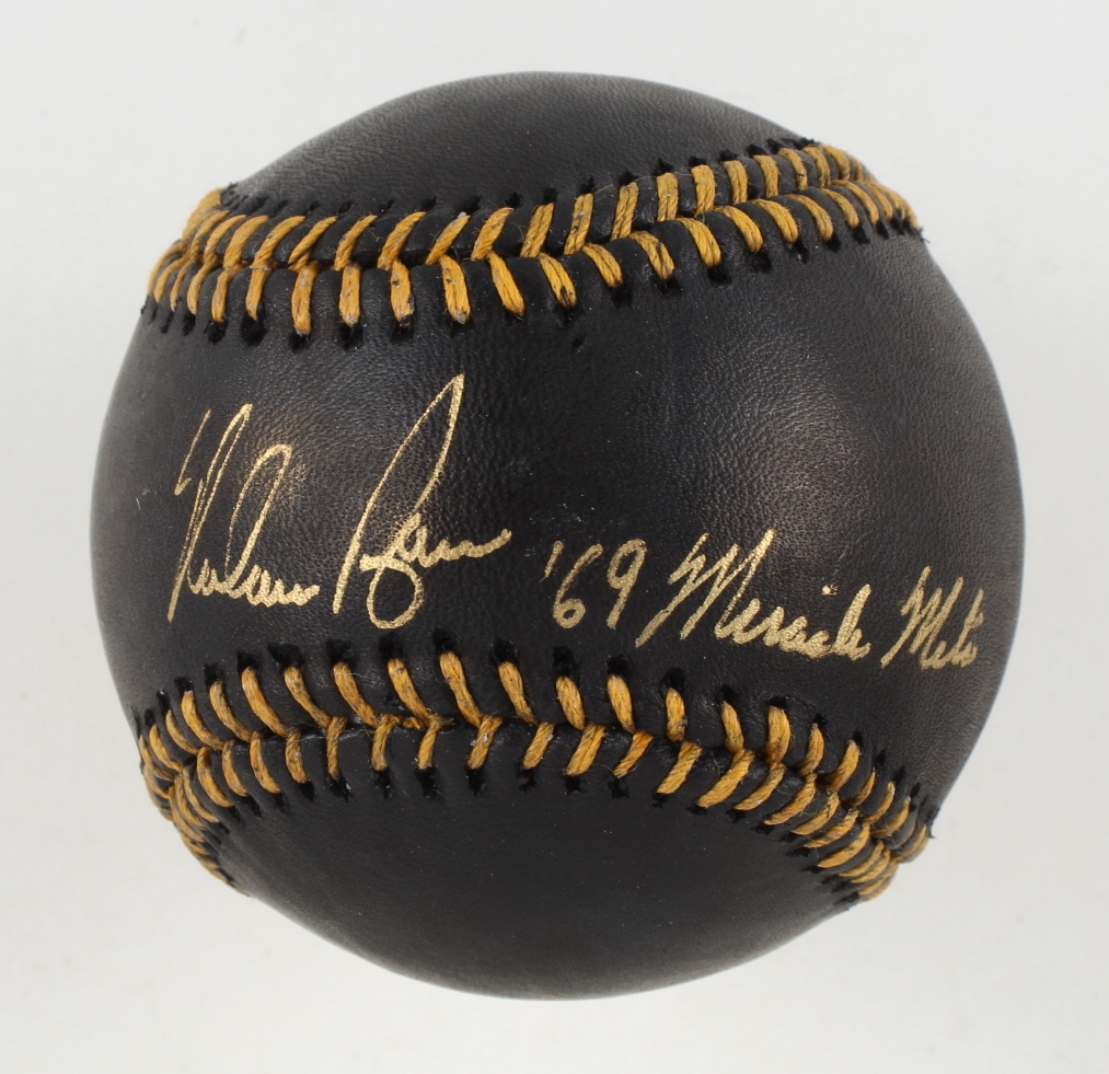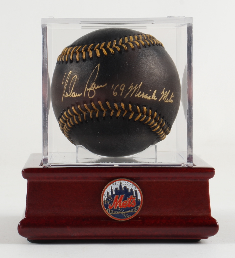 Nolan Ryan Signed Black Leather OML Baseball Inscribed "'69 Miracle Mets" with Display Case (PSA)